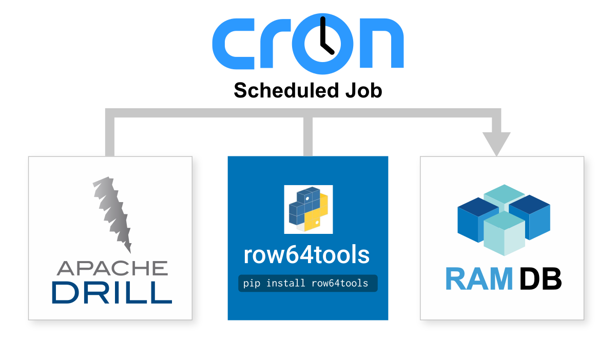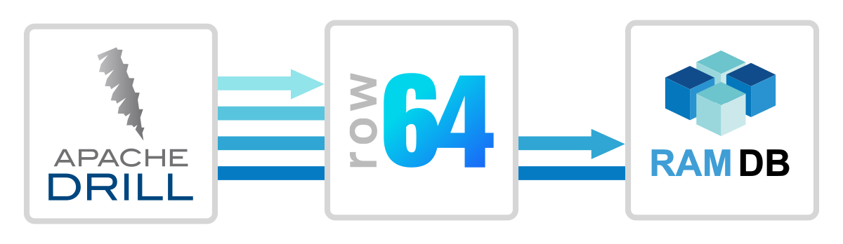 Apache Drill is a low latency distributed query engine, designed for short, interactive ad-hoc queries on large-scale data sets. Apache Drill integrates easily with Row64 by wiring to Row64 RamDb through Python.