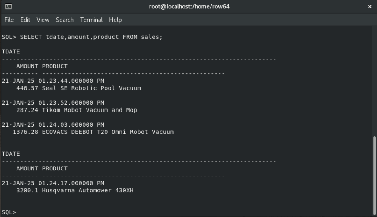 CREATE TABLE sales (tdate TIMESTAMP, amount DECIMAL(15,2), product VARCHAR2(50));