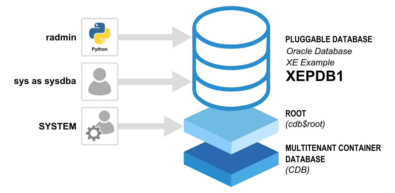 It is not possible to connect to the database as SYSTEM to create the tables that are accessed from Python. This approach is insecure, so Oracle prevents it. Instead, you will first connect to the example pluggable database (XEPDB1) as sys as sysdba. From there, you will create a new user, radmin, which will be the account used to create and query tables from Python.