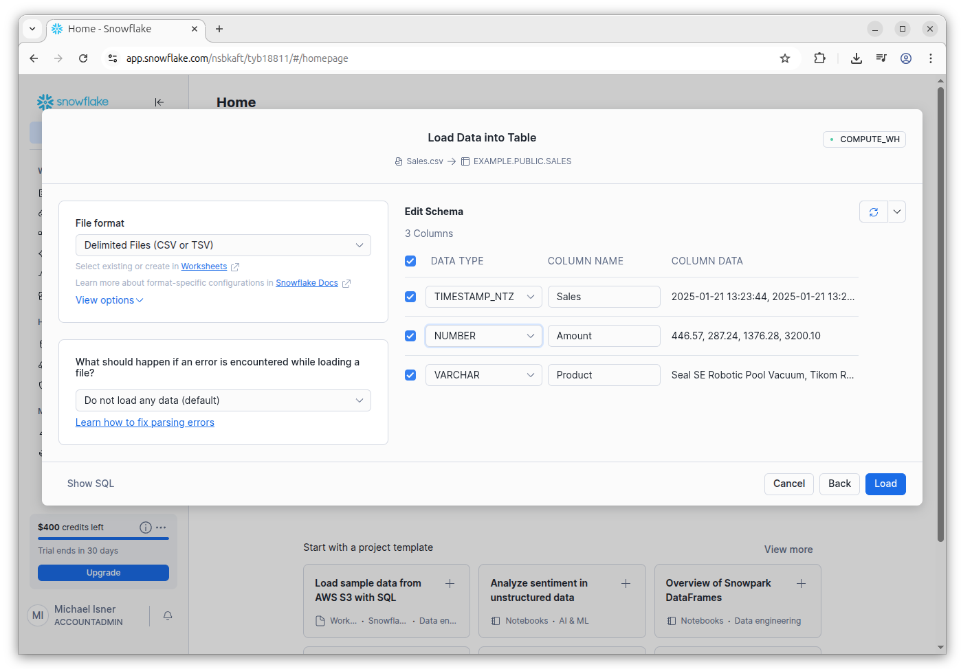 Click the Next button. Snowflake will automatically determine the data types, including the TimeStamp. Click the Load button.
