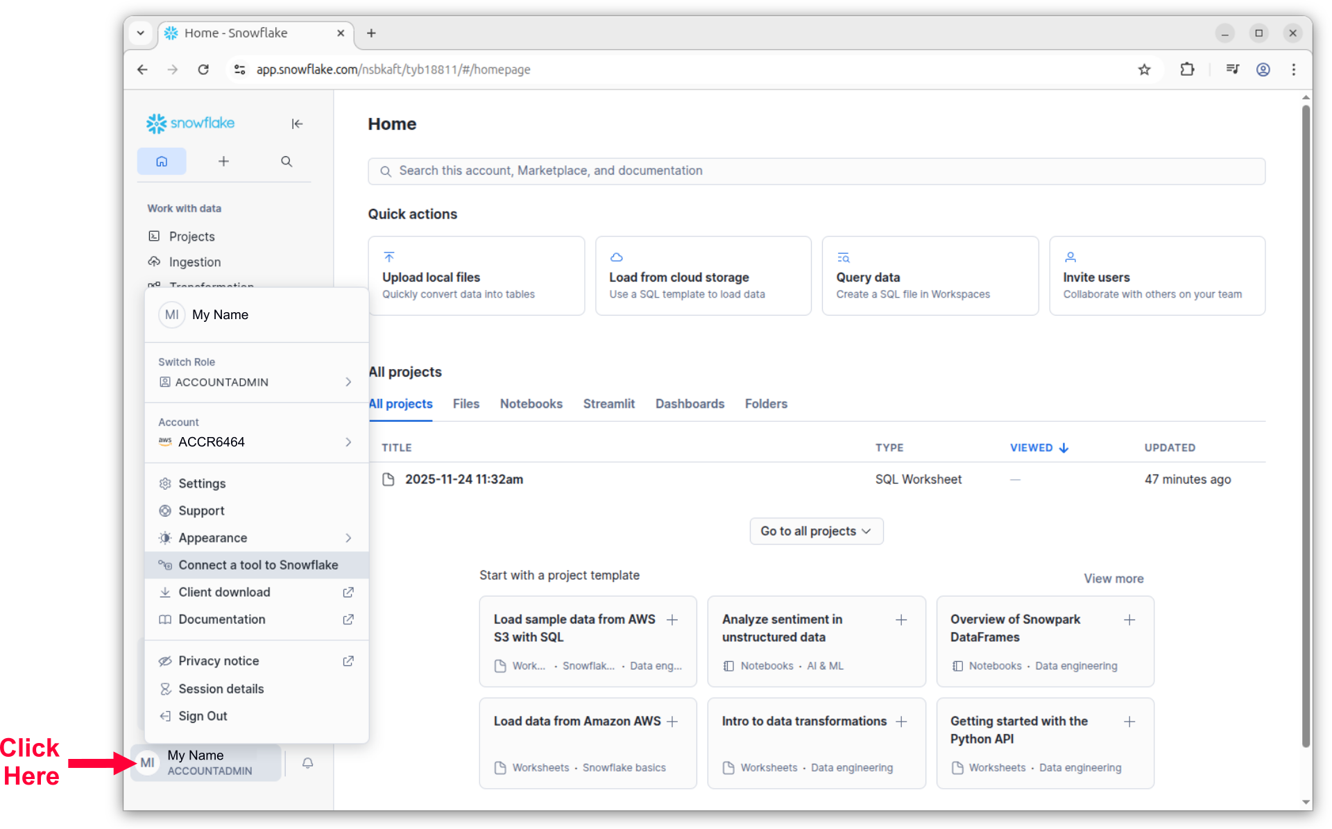 Click on the user button and select "Connect a tool to Snowflake."