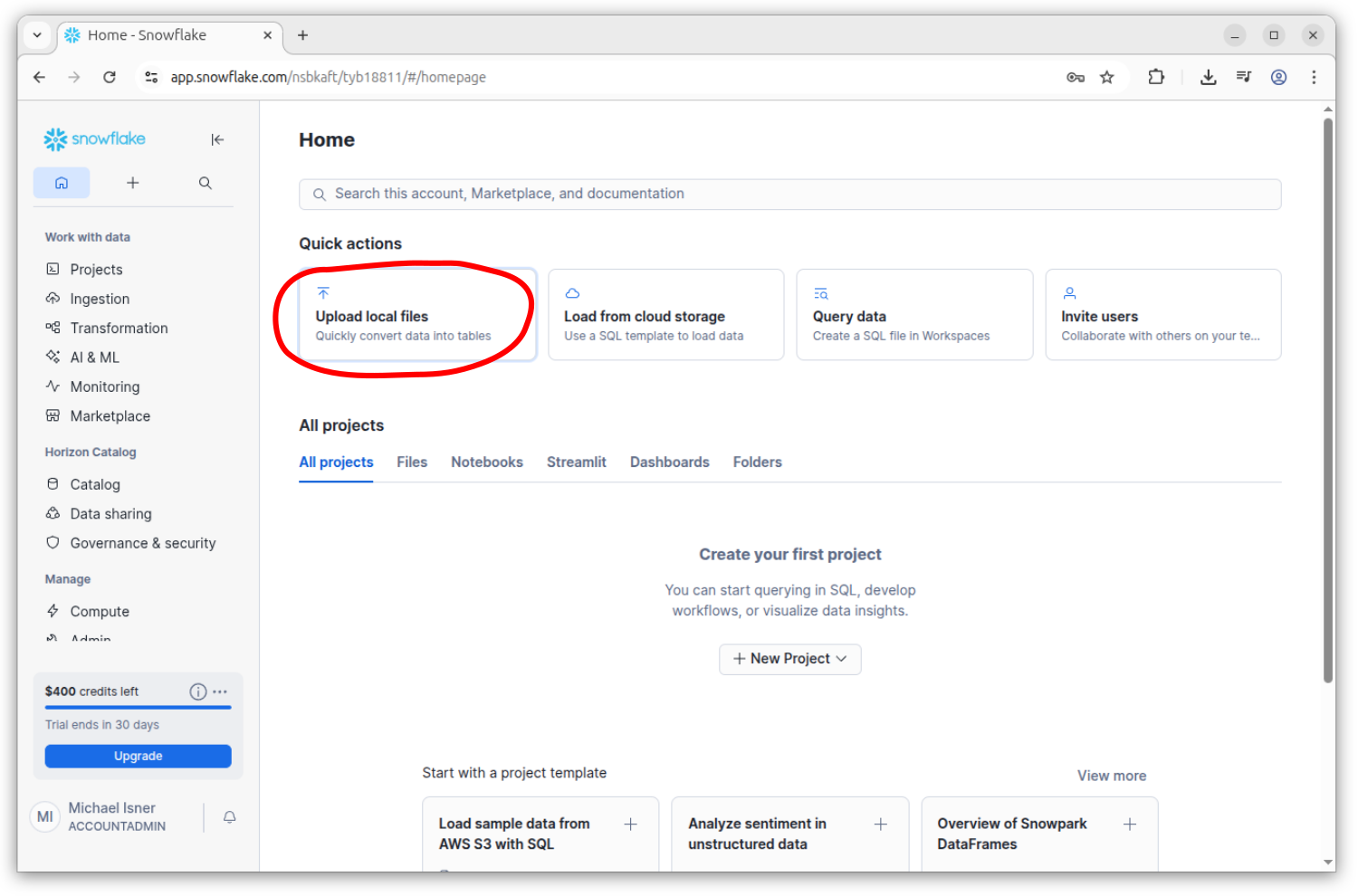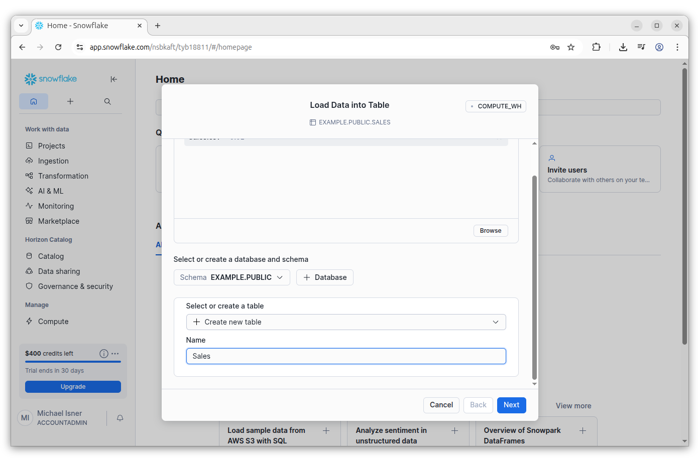 Find the Sales.csv file in the downloaded folder and upload it to Snowflake by dragging it into the drag target in the browser.