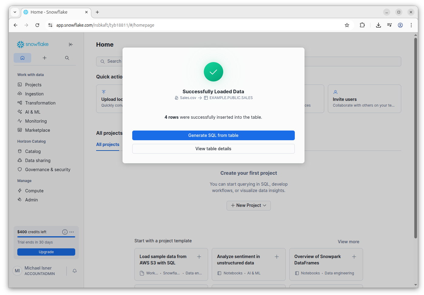You should see a green check mark icon and a message that confirms that the data was successfully loaded. Next, click "Generate SQL from table."