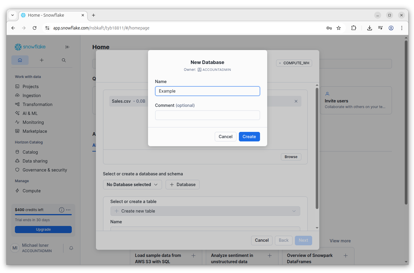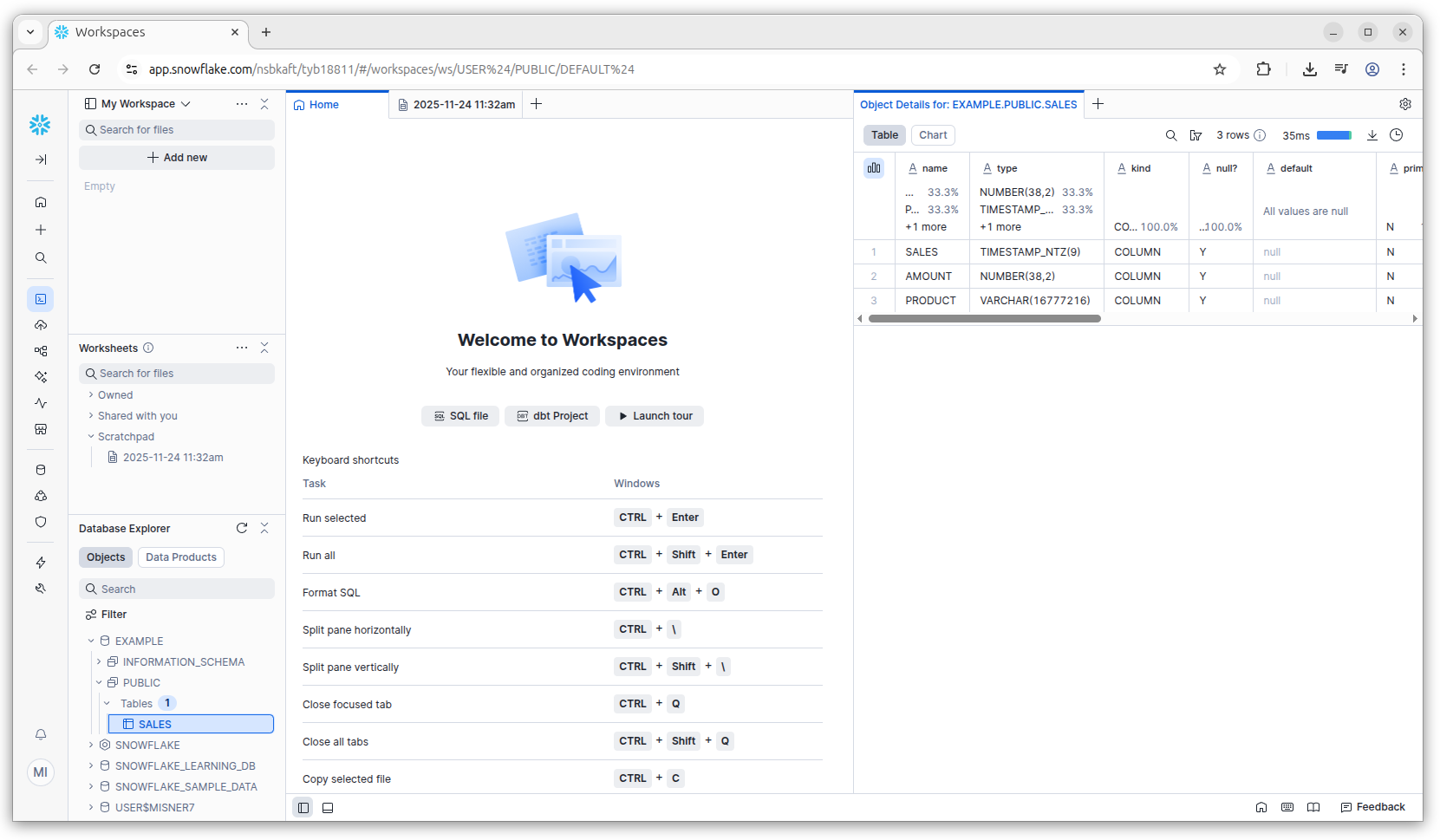 After selecting the option, you will be directed to Snowflake Workspaces. Find the Database Explorer navigation in the bottom left and expand the details on the new SALES table.