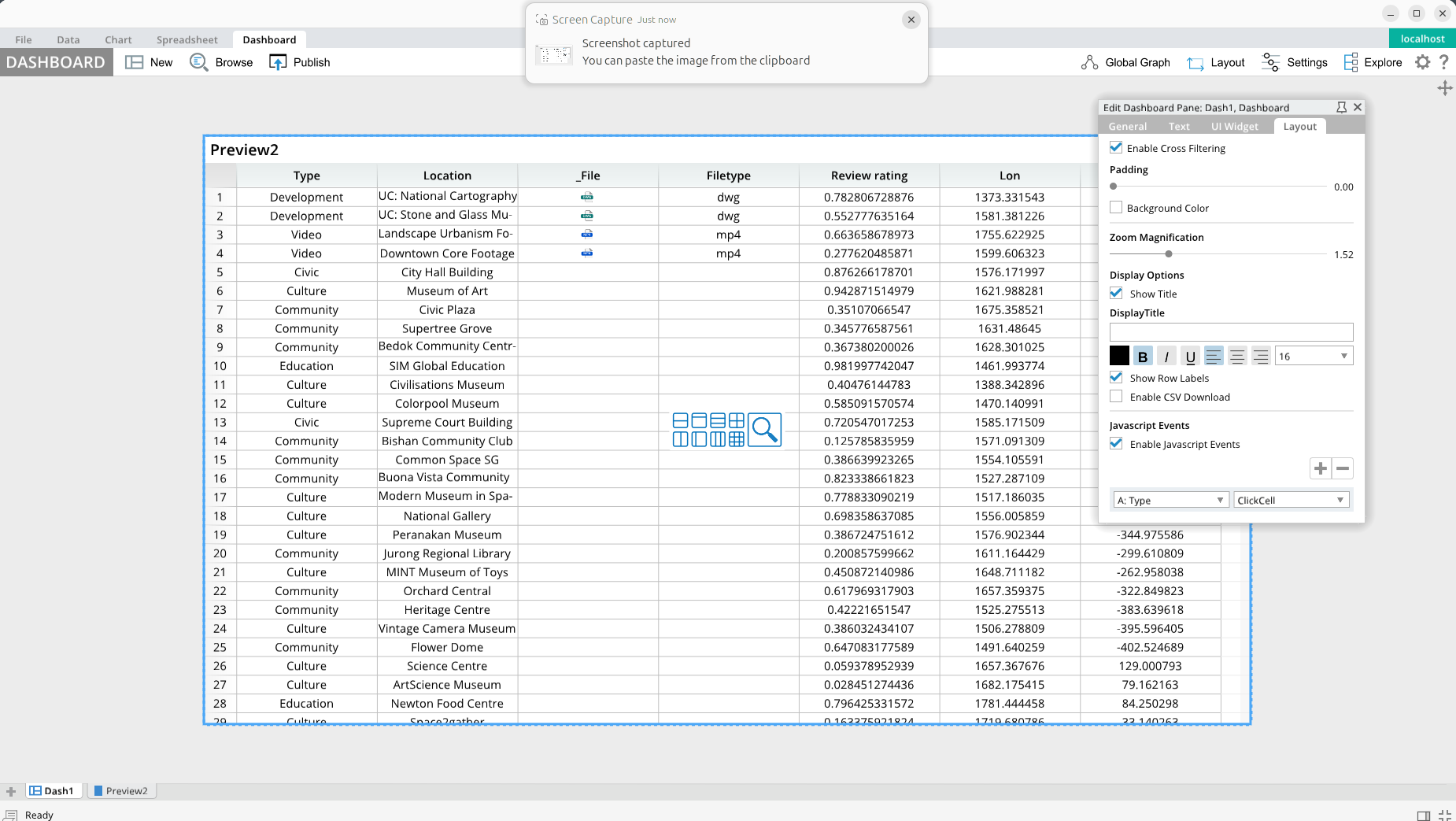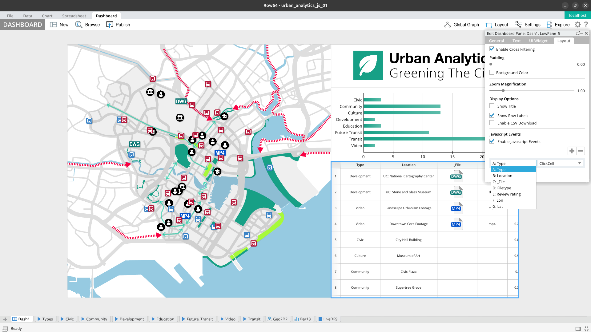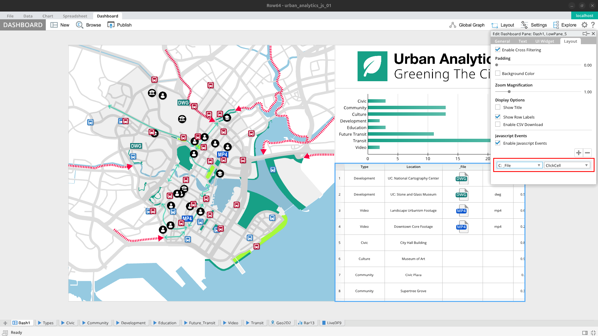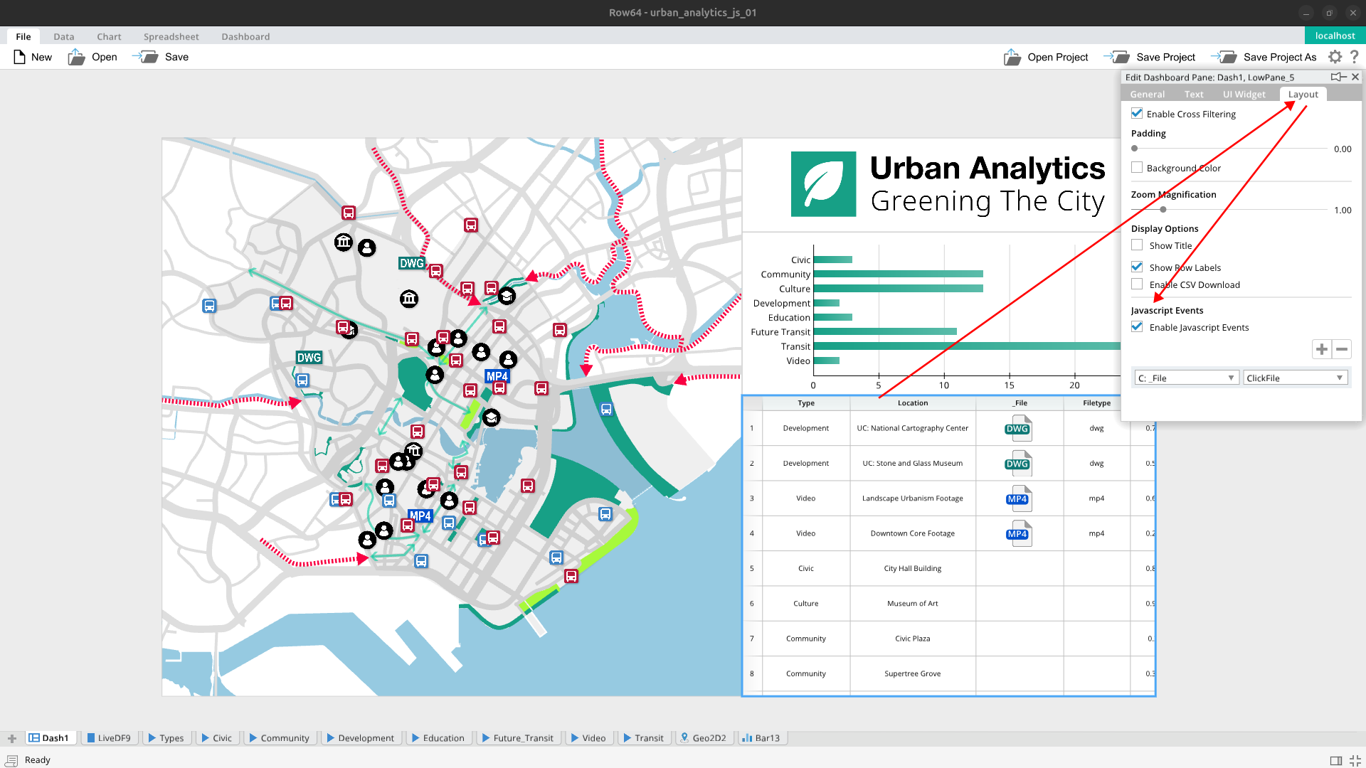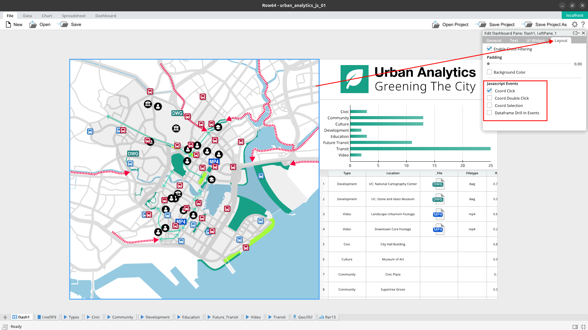 In the Row64 Studio Urban Analytics project, double-click the file spreadsheet pane in the bottom right corner to pull up the Edit Dashboard Pane window. In the Layout tab, review the Javascript Events settings.