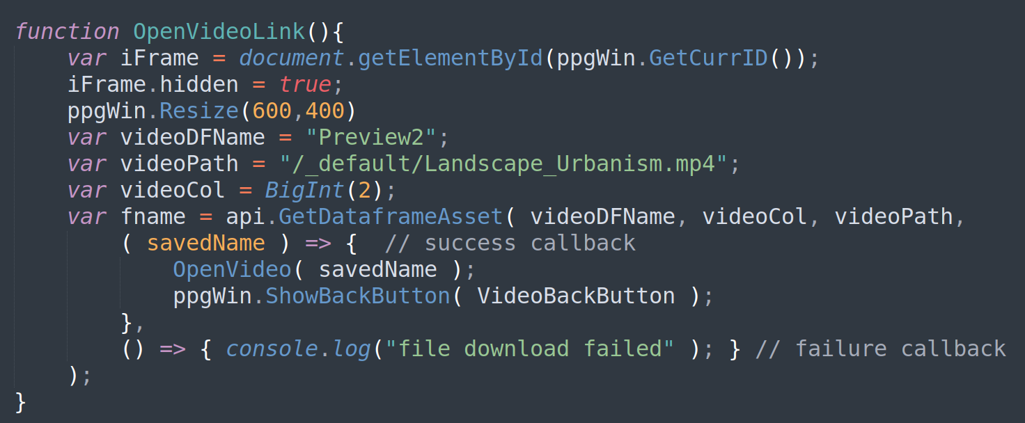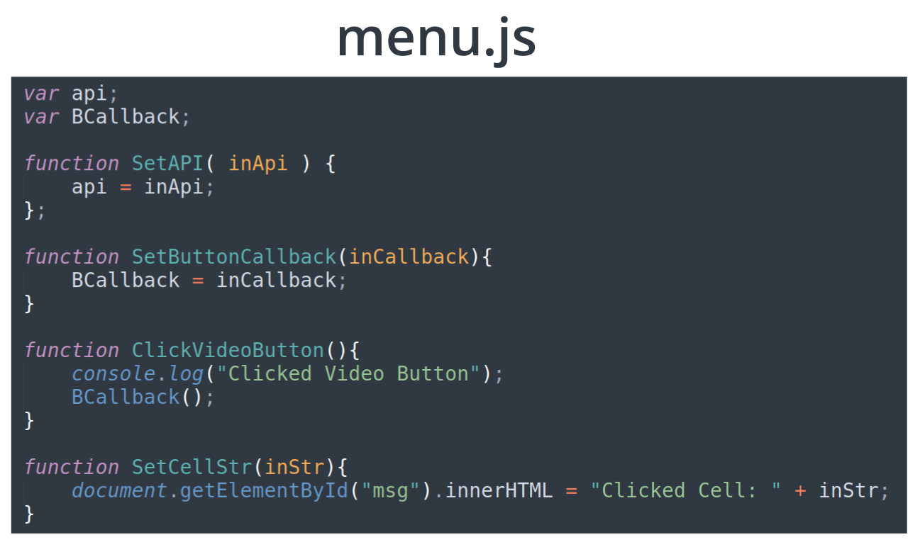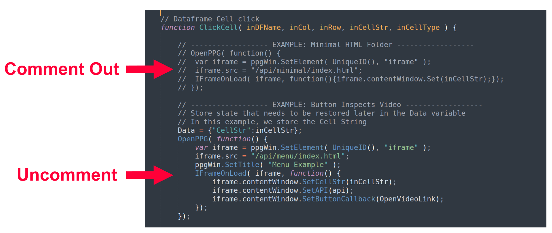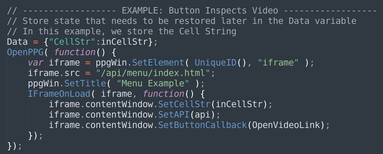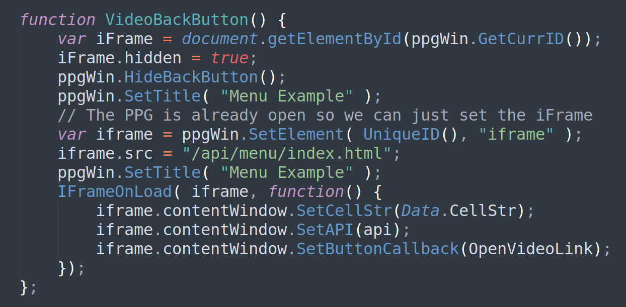 We have a new “menu” folder with our PPG in it. We’re setting our Cell String the same as in Example #3. We’re setting the callback for our button to another function in dashEvents.js called OpenVideoLink().