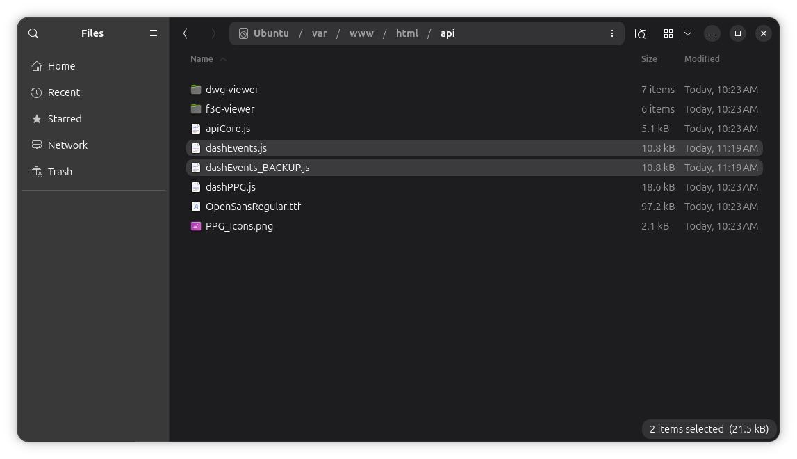 For example, the following image shows the /var/www/html/api directory with its original contents, in addition to a new dashEvents_BACKUP.js file that was made by copying and renaming the dashEvents.js file. The copying and renaming was performed manually by the user.