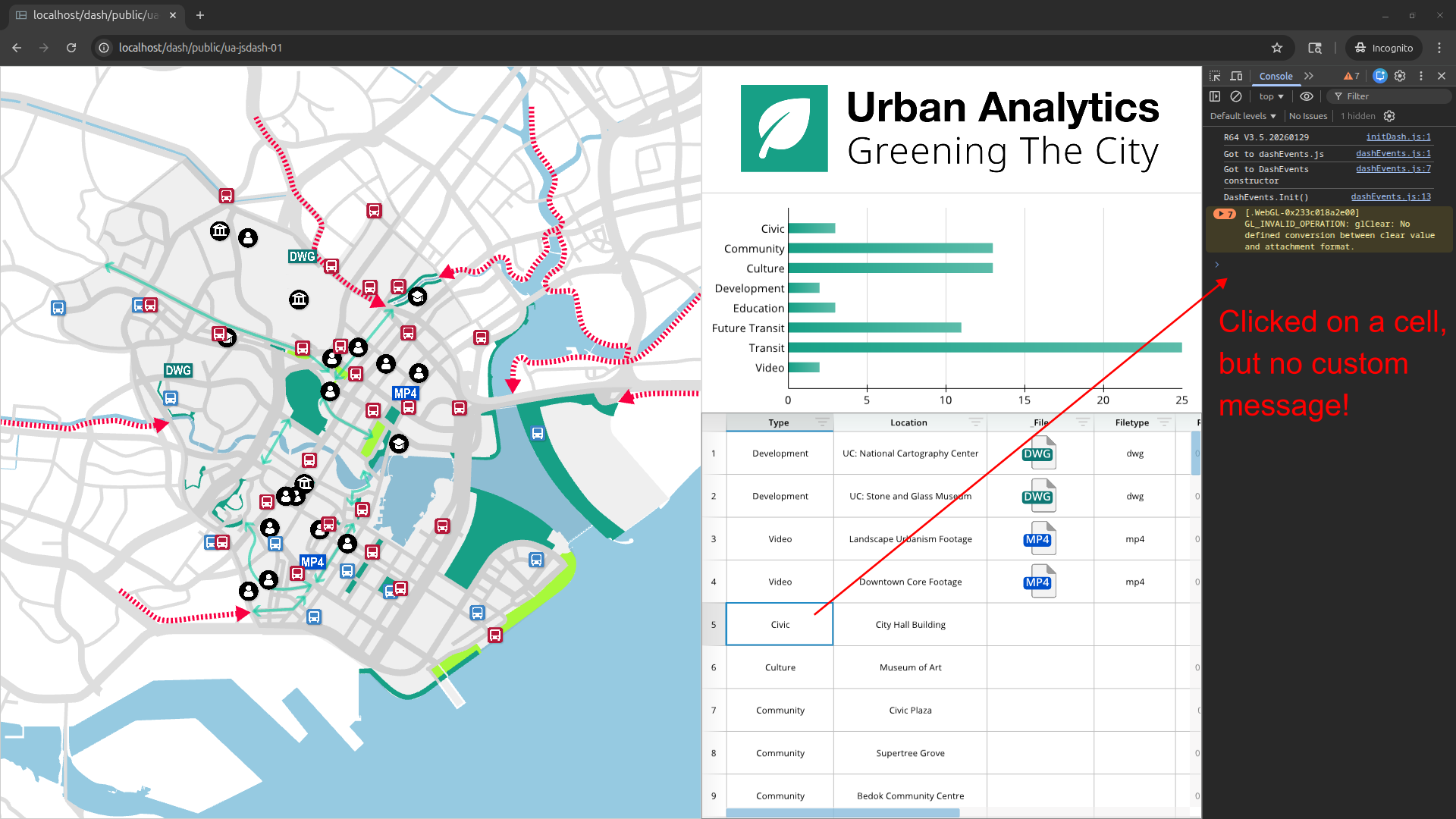 With the browser console open, click on a cell in the Type column. You should see your custom message appear.