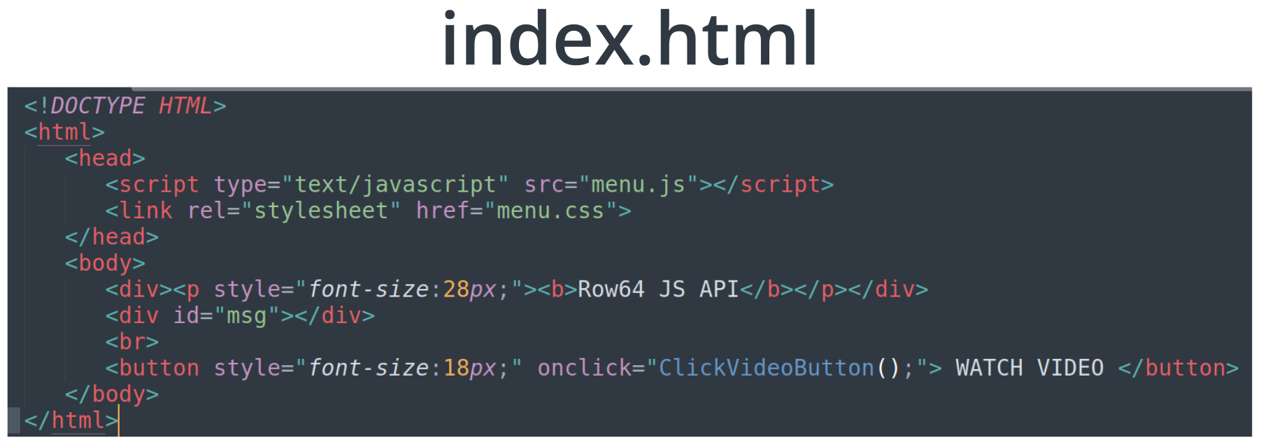 The index.html file is more standard and less minimal. It attaches a .js and .css file. It has a button with an onclick event to JavaScript.