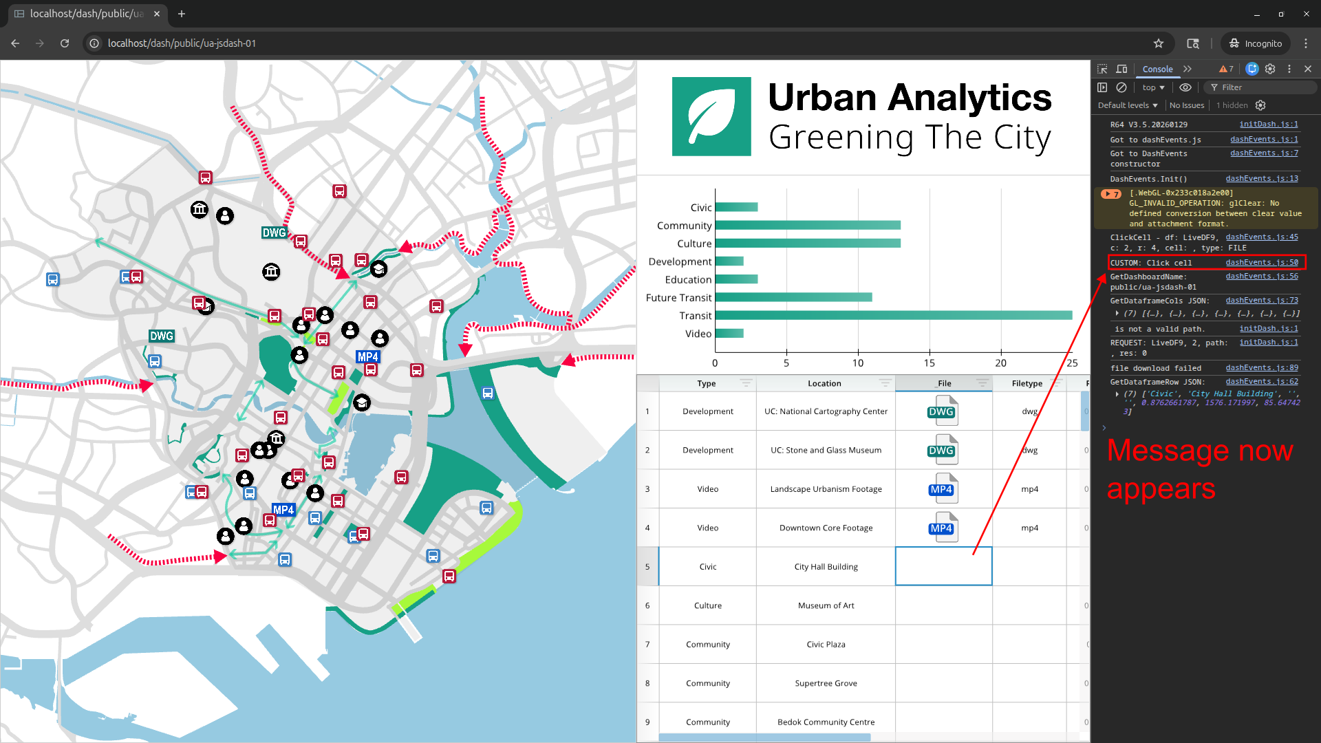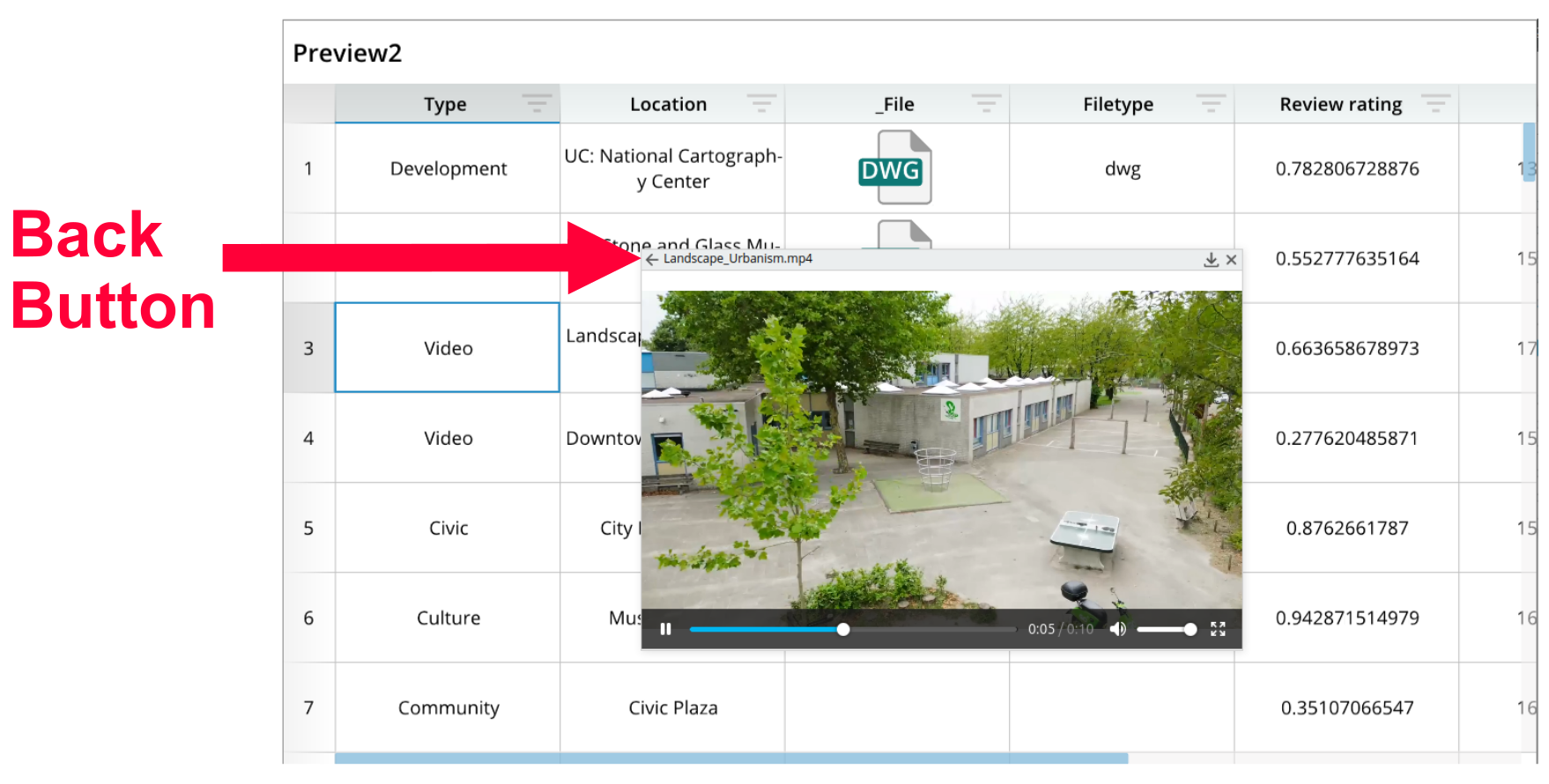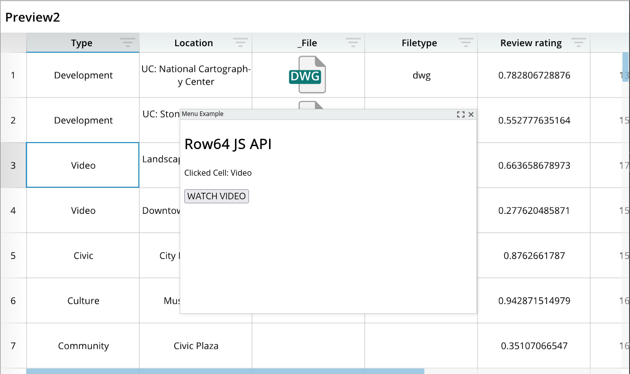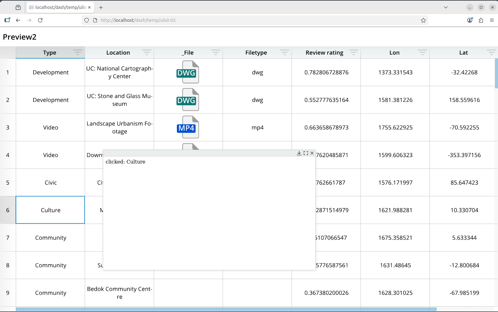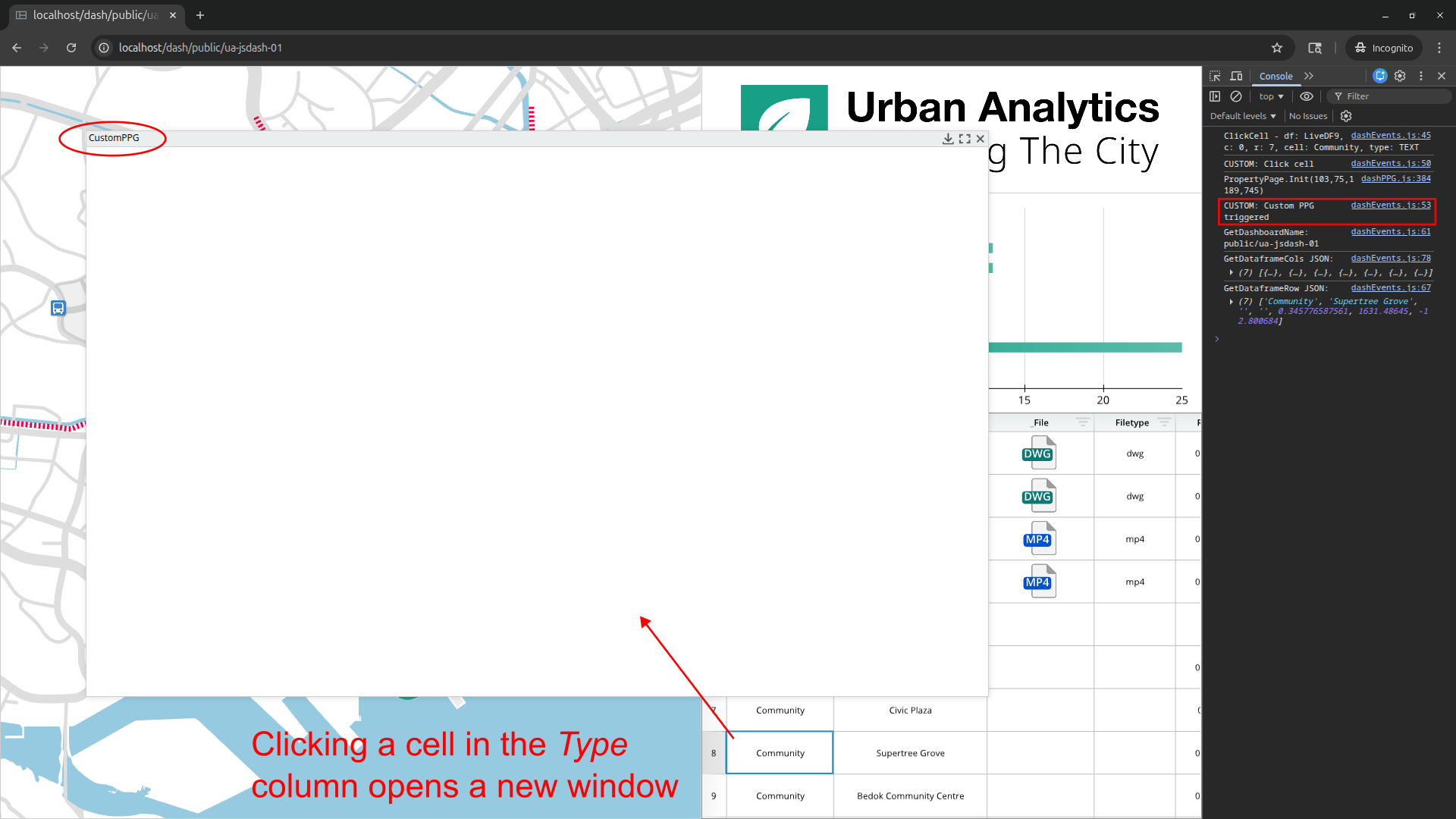 This example demonstrates how to open a custom pop-up window when a user clicks on a cell in the Type column of the file spreadsheet pane of the Urban Analytics project.