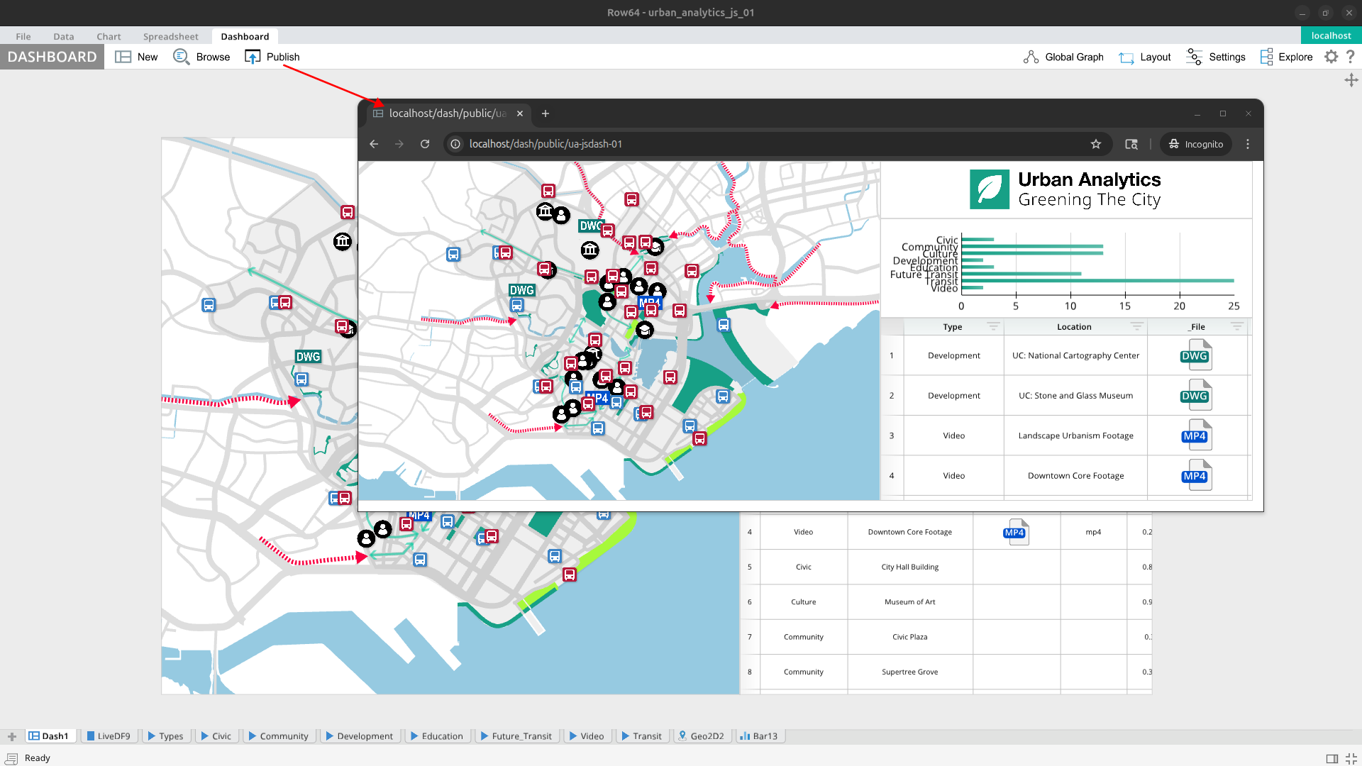 In Row64 Studio, in the Dashboard tab, select Publish to publish the dashboard to the browser to test the new functionality. (You'll need to publish the dashboard every time you want to see changes in the browser).