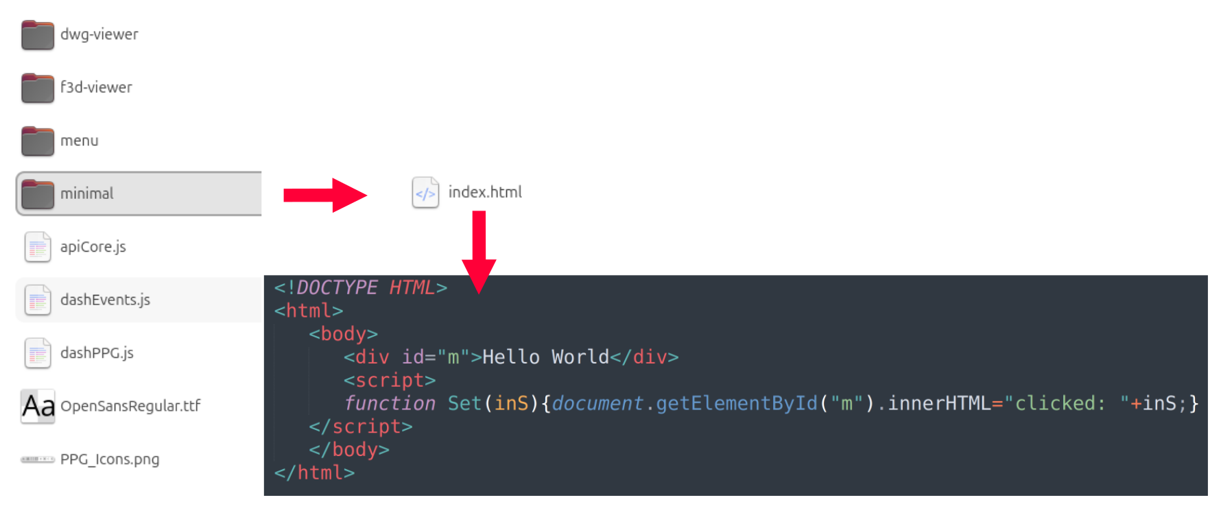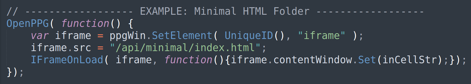 If you review your api folder, you'll see there's a sub-folder called minimal, which contains a single index.html file. That file is populating the iframe inside the PPG. It has a single inline function called Set(), which is filling the text in a <div>.