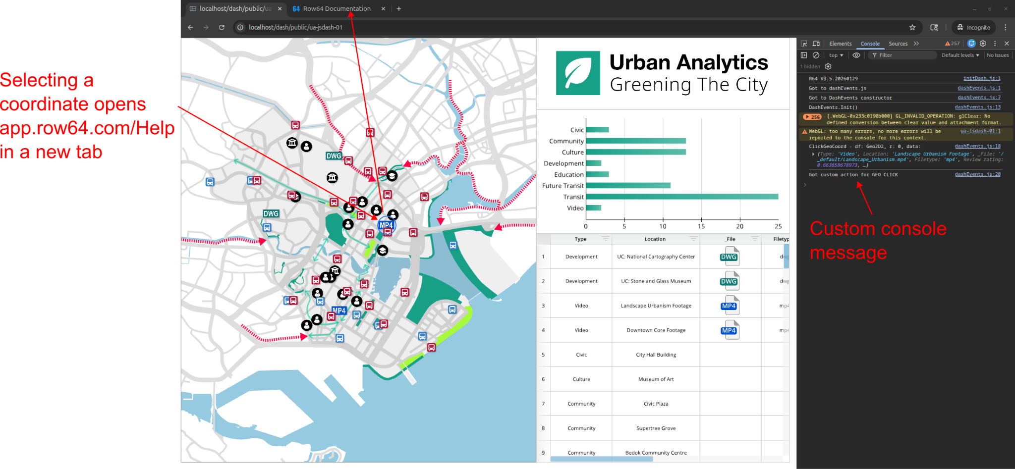 This example will update the behavior of the ClickGeoCoord function to have the Row64 Help site open in a new browser tab when a user clicks on a map coordinate in the dashboard.