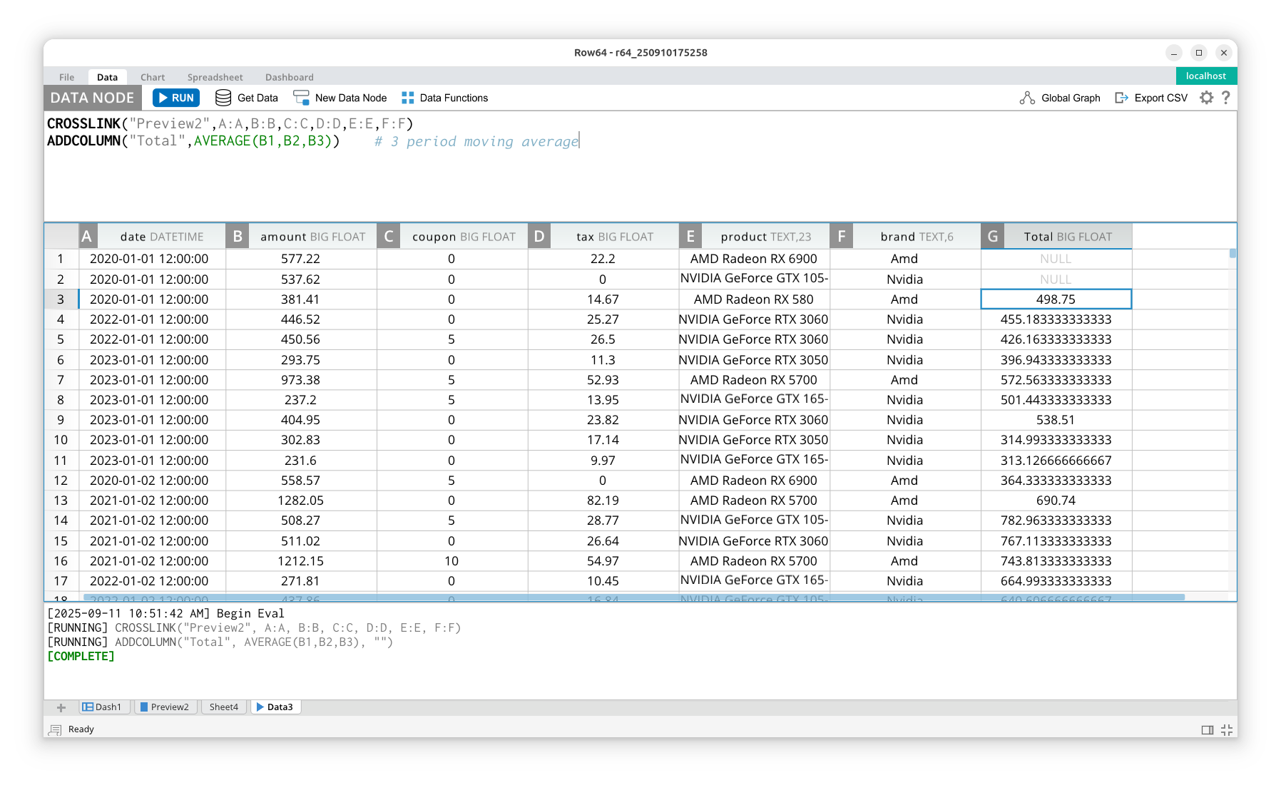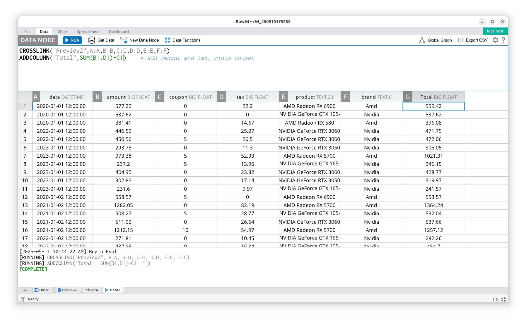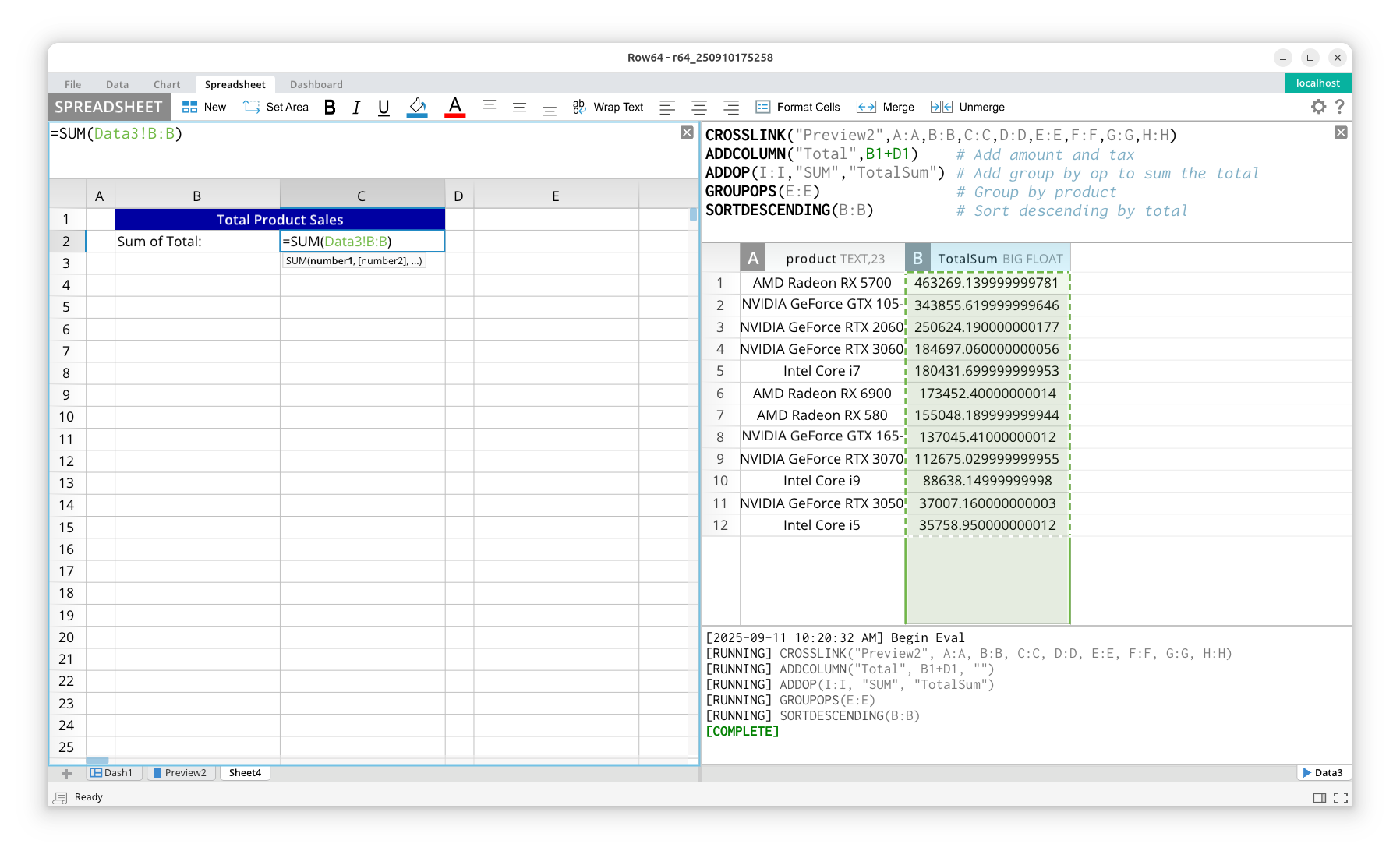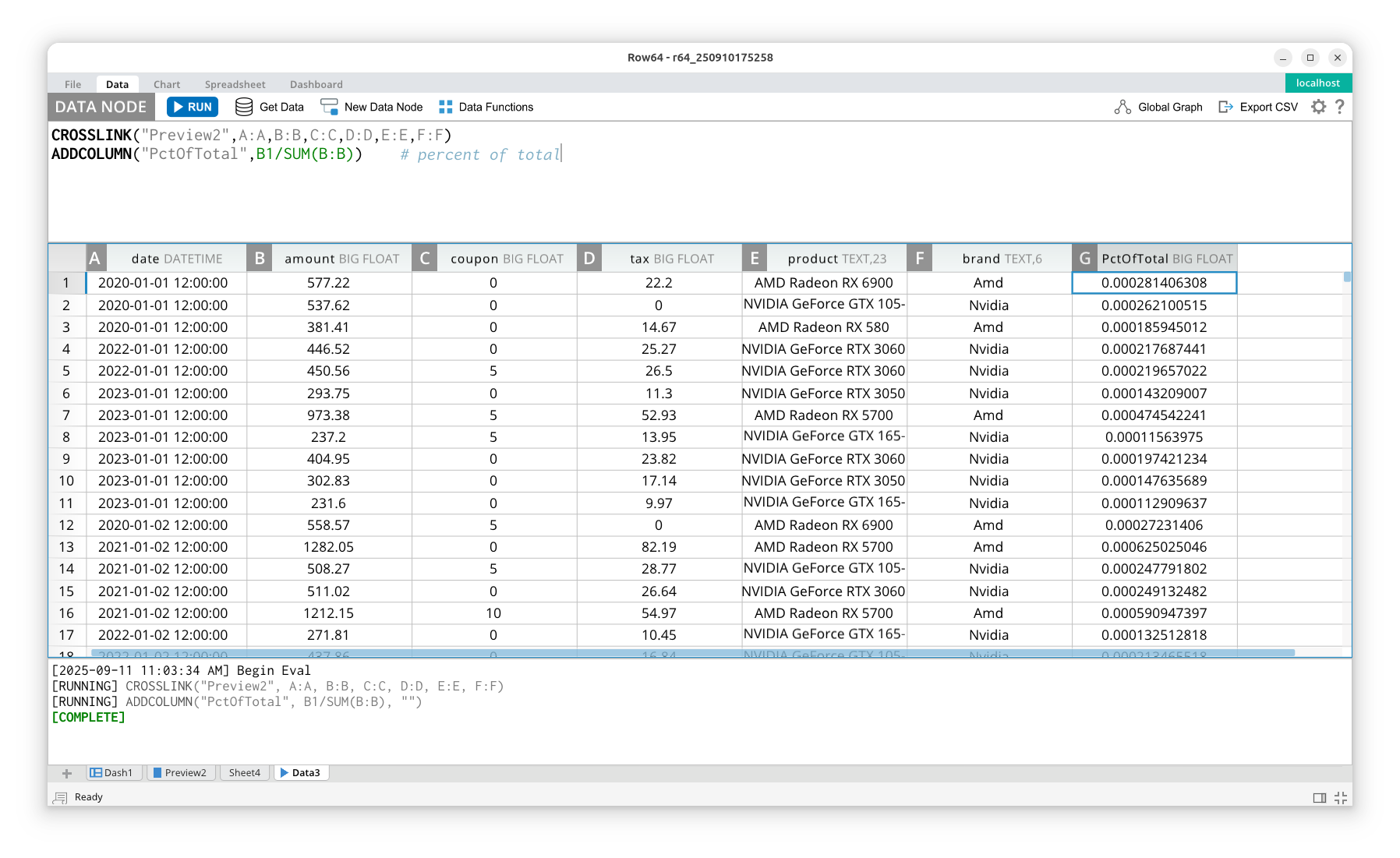 A feature of spreadsheet formulas is the ability to link to dataframe cells. This allows for seamless integration between function evaluation and formula evaluation. In the example below, you can see that, on left pane, we have a spreadsheet that includes a formula that links to a dataframe column in the right pane.