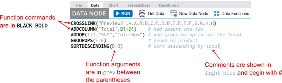 Below is an example of a Dataframe editor with functions. The Dataframe editor is a basic code editor and provides some syntax highlighting to assist with distinguishing different parts of the function commands.