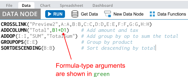 Some Functions, such as ADDCOLUMN, take a formula as an input argument. Formula input arguments are displayed in green.