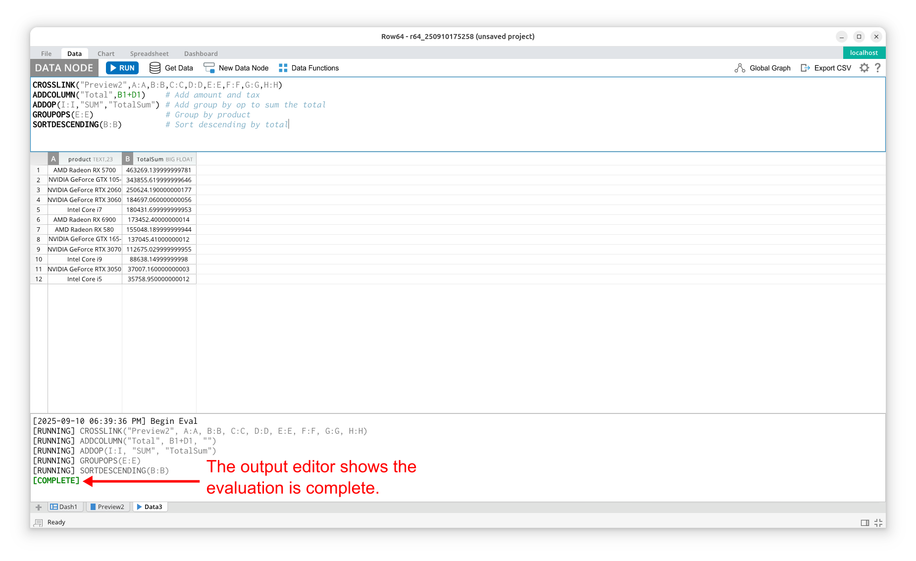 When you are ready to execute your set of functions, click the RUN button at the top. When your functions have finished executing, the output editor will indicate that the evaluation has completed. The resulting table is displayed in the dataframe.