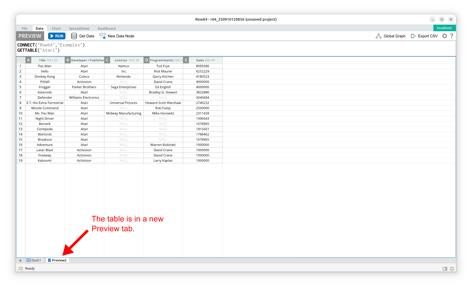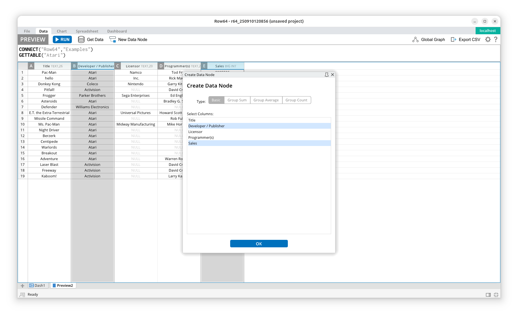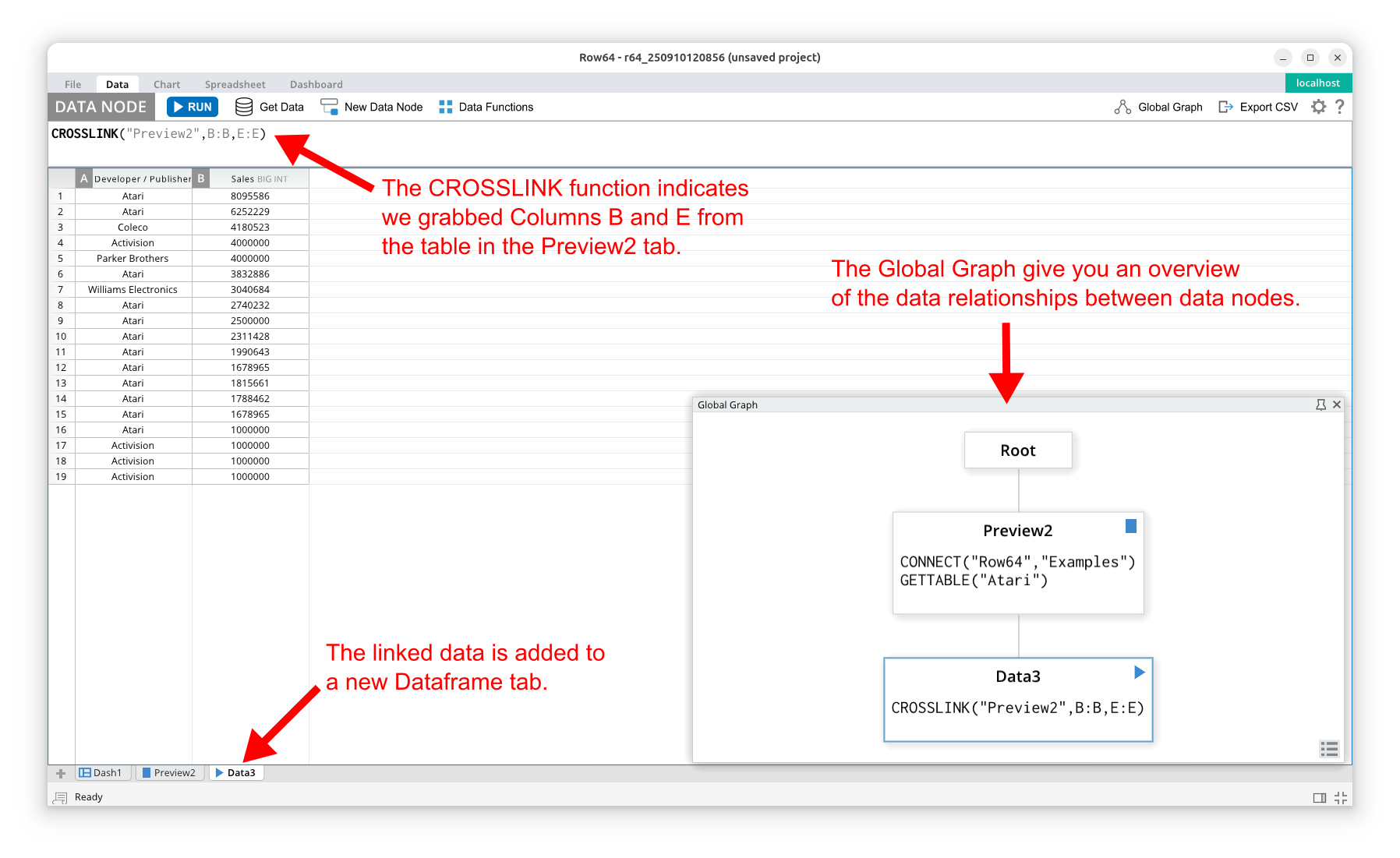 The Global Graph is an overview of the evaluation graph within the Row64 Studio project. This describes how data is related and transformed within the project. The Global Graph window pops up whenever you create a new data node. In our example, you can see we retrieved a Preview from the Atari table from the Row64/Examples data group, and then we derived a Dataframe from Columns B and E using the CROSSLINK