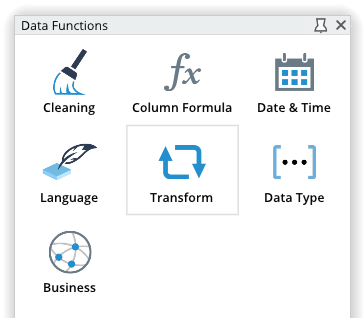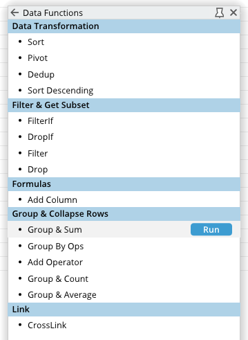 To get started with analyzing Dataframes, click on the Data Functions button to get a list of preset function examples. This is a quick lookup for inserting function examples into your data node editor.