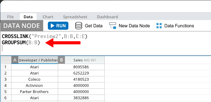 Notice, this inserted a line with the GROUPSUM function into your editor. This function will sum up all numeric columns by unique values found in the specified column.