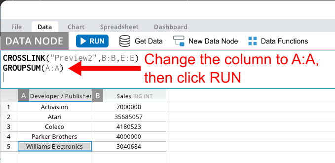 column to A:A, and then click on click on RUN. This will return a table with the total Sales for each Developer / Publisher.