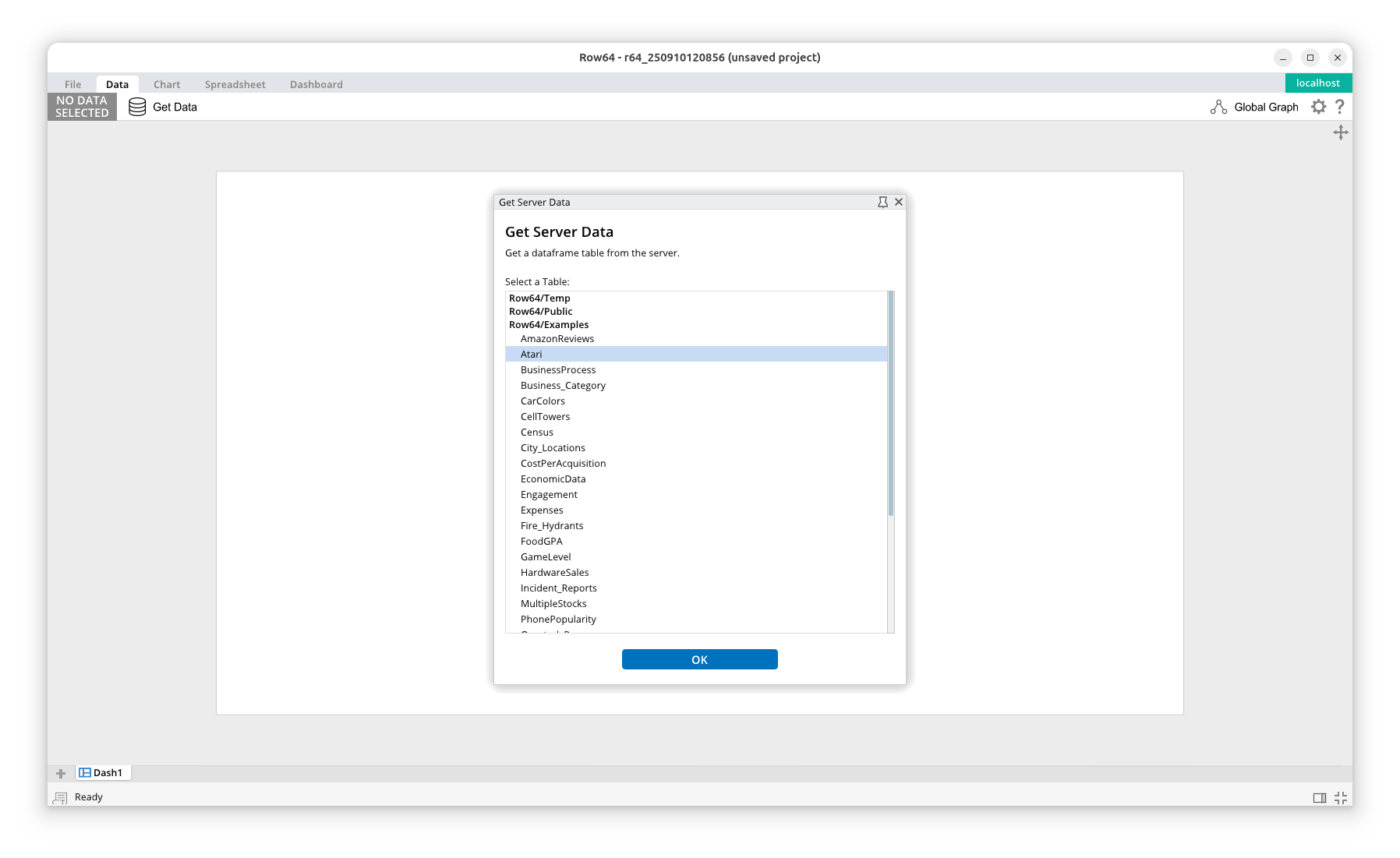 Dataframes are the primary way of working with data in Row64. To work with Dataframes in Row64 Studio, you must be connected to a Row64 Server. For instructions on how to install and get started with a Row64 Server, please see the Connect To Server page. Once you have a running Server, you can download tables or upload your own data.
