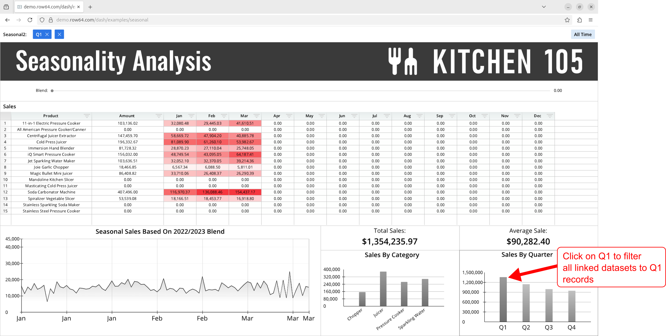 The Seasonality Analysis example dashboard showcases the dashboard crossfiltering capabilities. If you click on the Q1 bar of the bottom right bar chart, then all datasets and charts linked to that Q1 column will be filtered to only Q1 records.