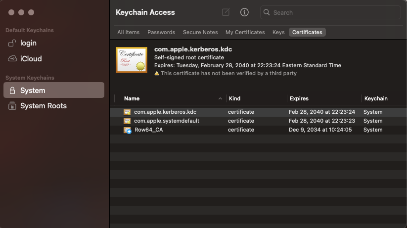 - Once installed, you can confirm in the KeyChain app your certificate is installed in the system folder under certificates->system
