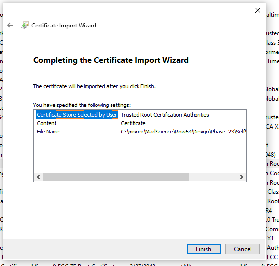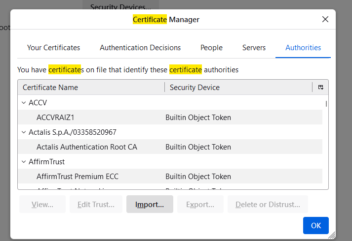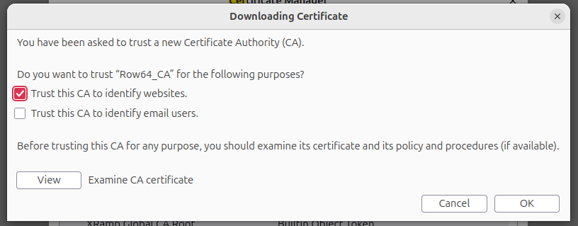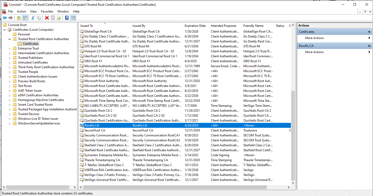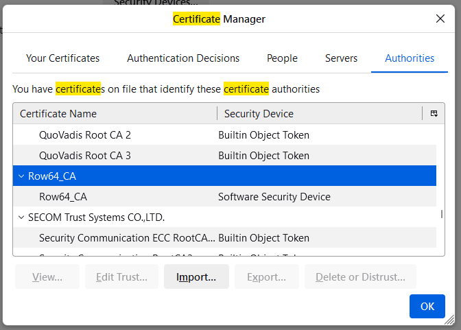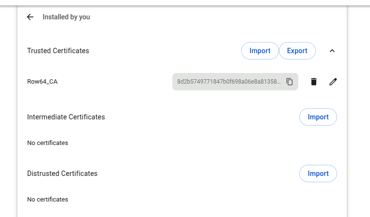 Scroll down and look for Manage Certificates. Then click into the Installed by you section. In the Trusted Certificates section, import your Row64 ca.crt file.