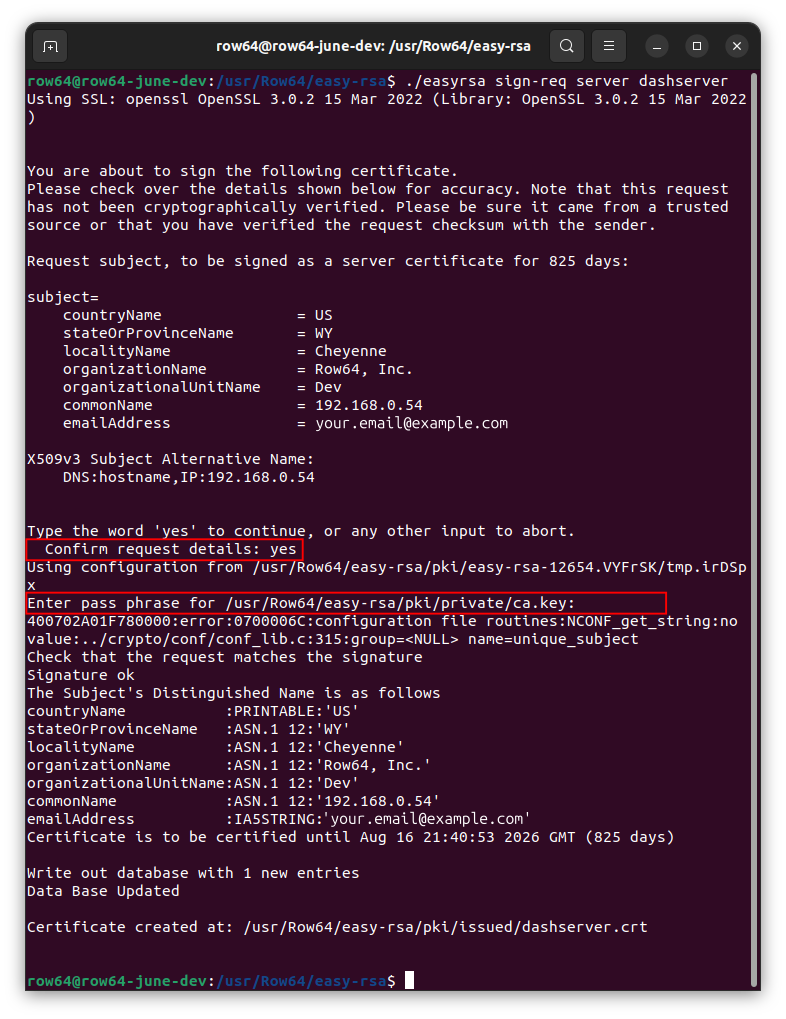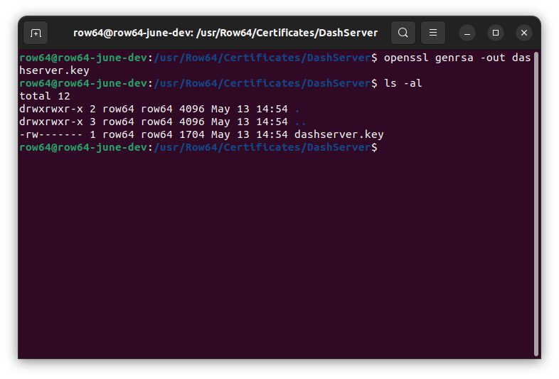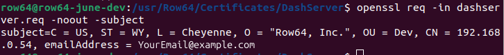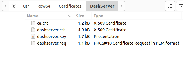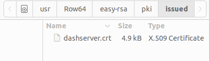 This will create a .crt file at the following location: /usr/Row64/easy-rsa/pki/issued/dashserver.crt.