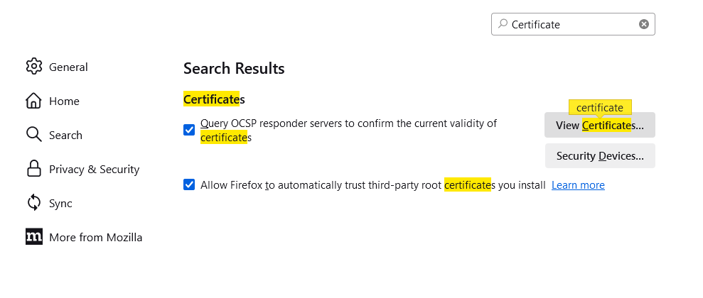 Open the Firefox settings and search for "certificate." Click on View Certificates.