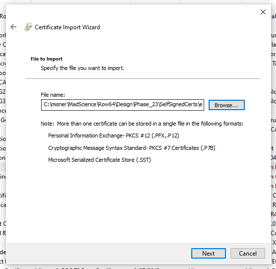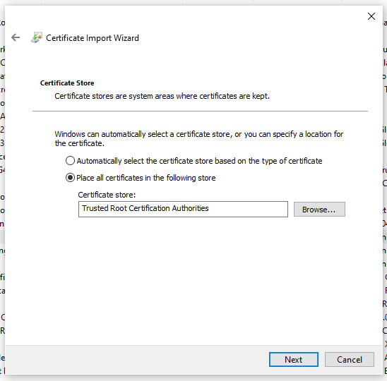 - Select Next, then Browse, and select the certificate you want to import. When you've found it, select Open, then Next.