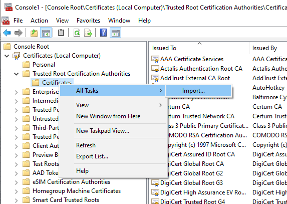 - Right-click Certificates. Then, select All Tasks, then Import.