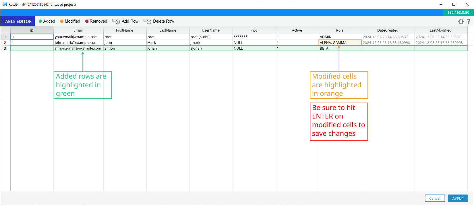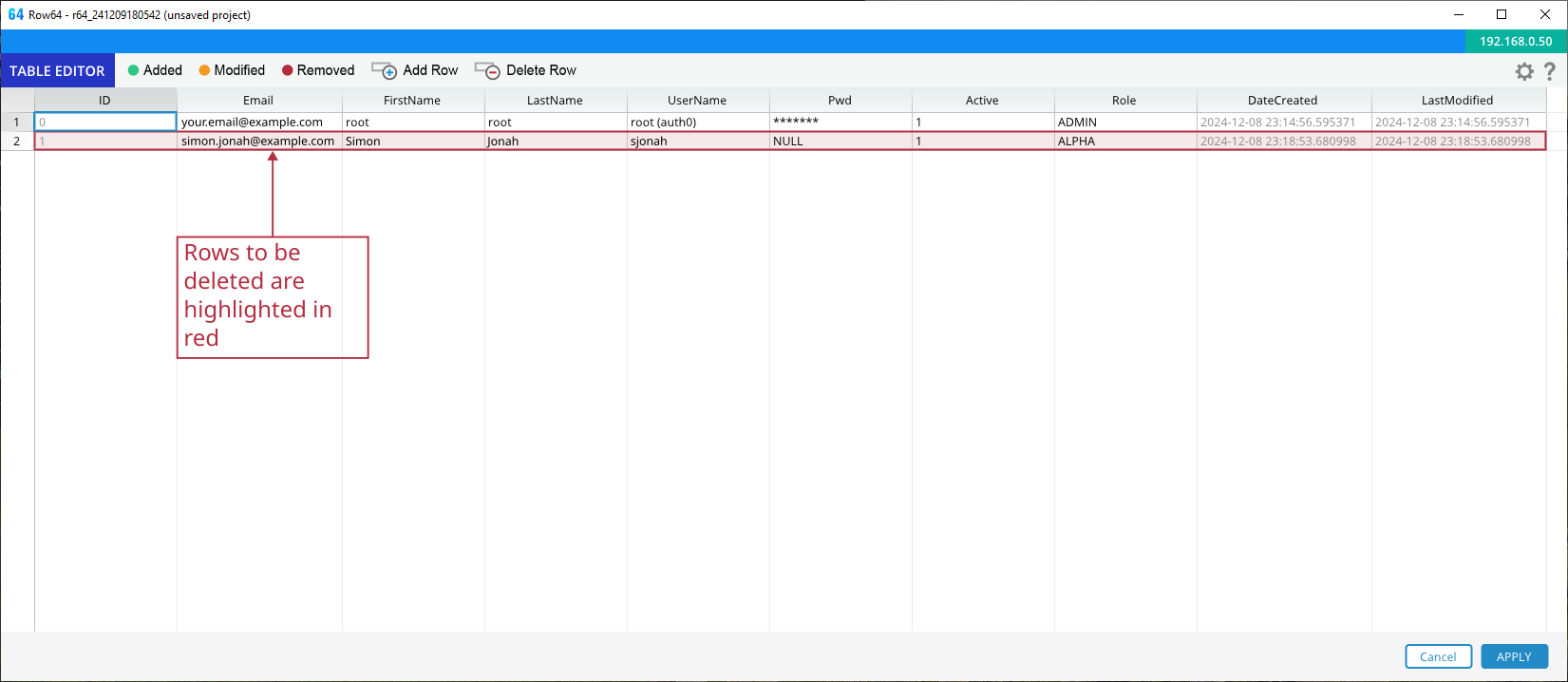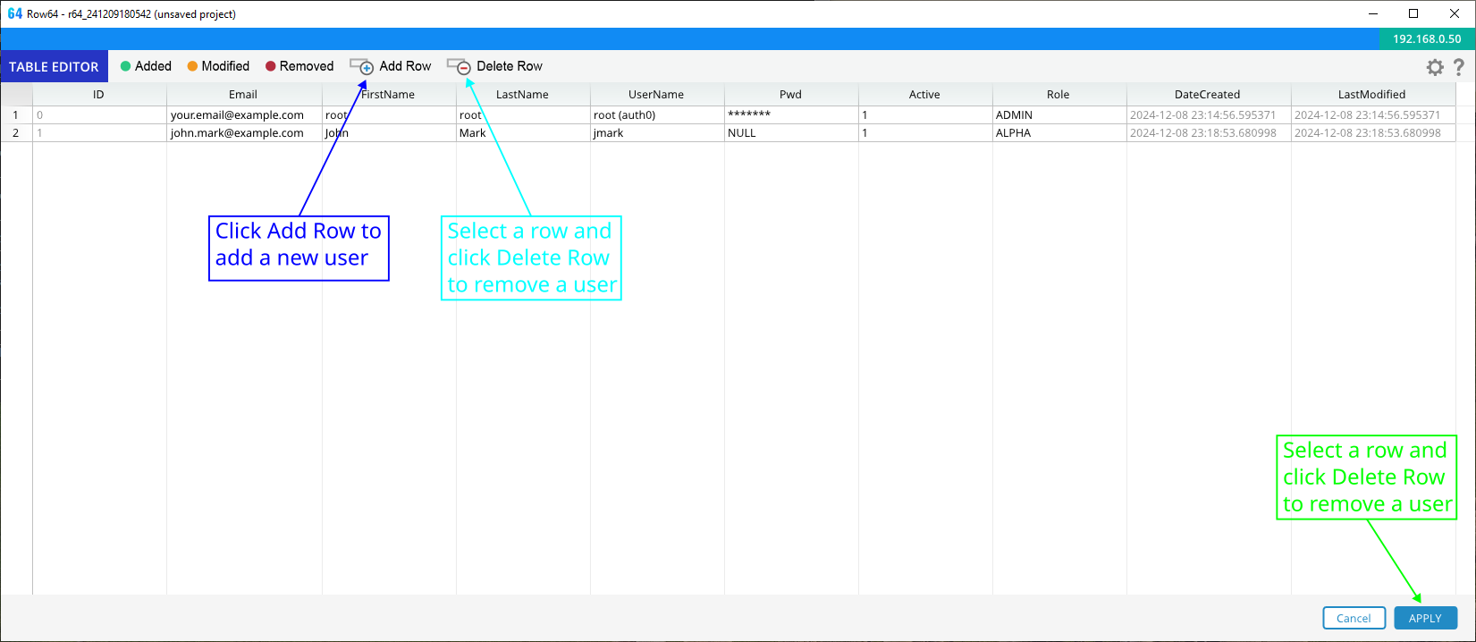 Users cannot be generated or managed from Row64 Studio until the root user has been created.