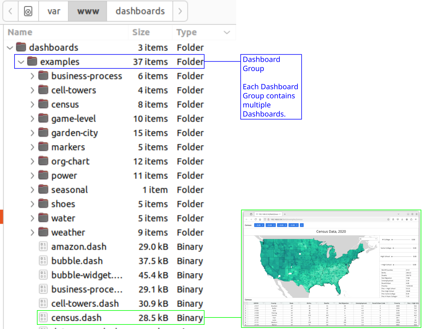 Dashboards are stored on the server as .dash files. All dashboards are stored at the following location: /var/www/dashboards