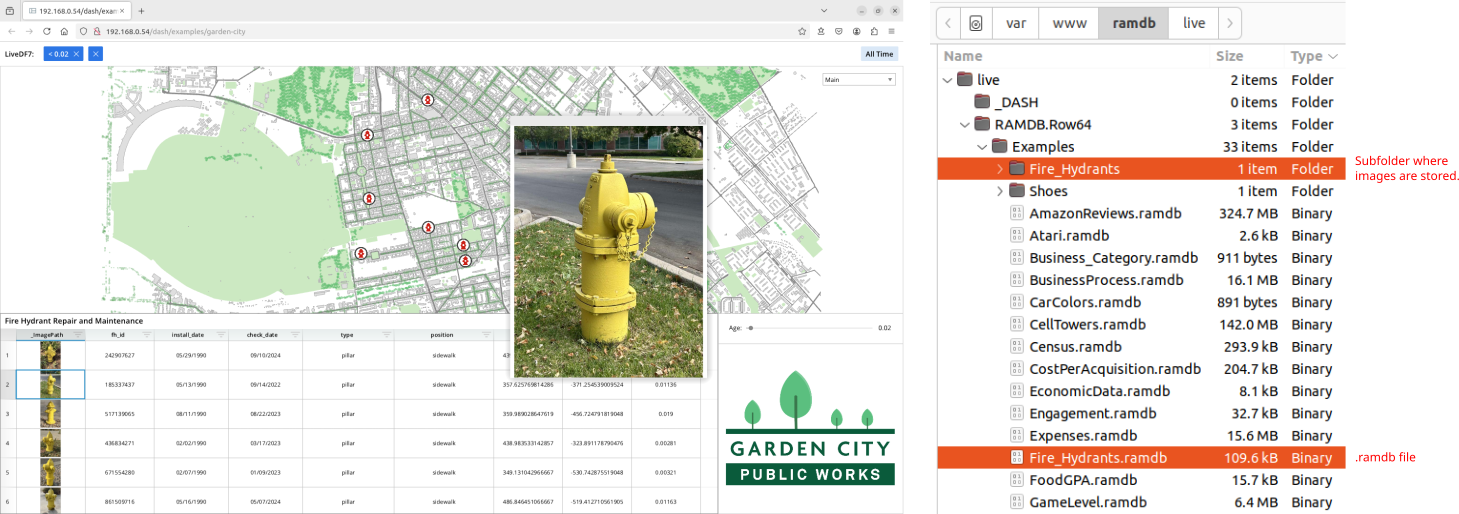 For example, the Garden City dashboard loads a dataframe called Fire_Hydrants that contains many images. As you can see, the Fire_Hydrants RamDb file is paired with a sub-folder where the raw images are stored.