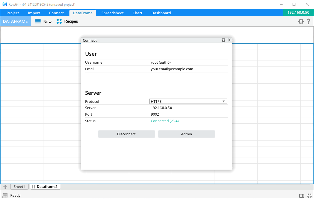 If you have successfully connected, then an Admin button will appear in the Connect window. Click this to open the Dashboard Admin UI.