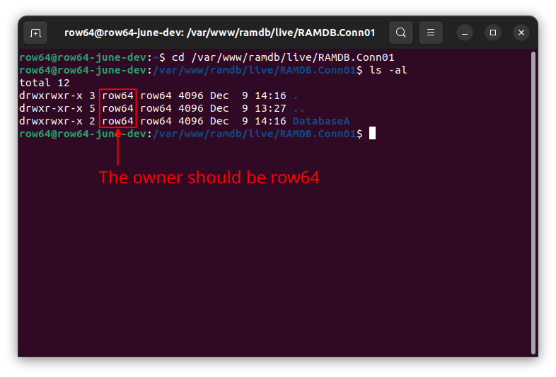 All folders and files in the /var/www/ramdb directory should have the row64 user as the owner. If the row64 user is not the owner of the directory and file, you can execute the chown command.