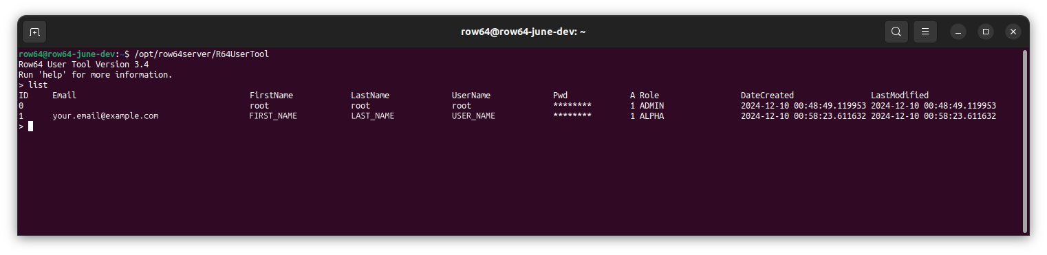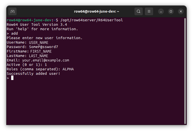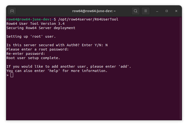To create the root user, run the Row64 UserTool. This is a command line utility for managing users.