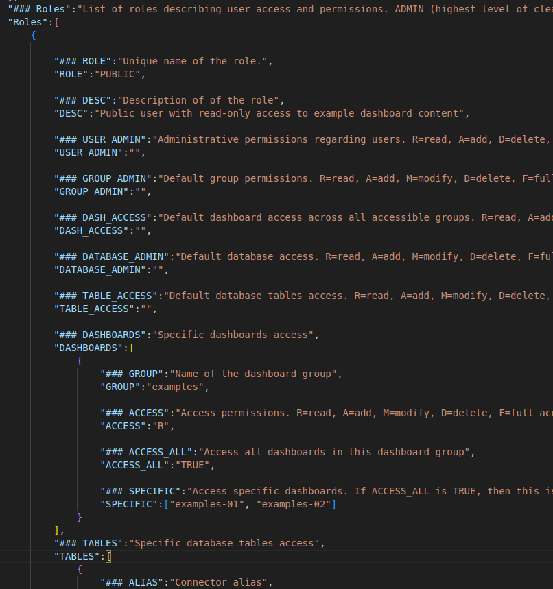 USER_ADMINdescribes permissions for managing the registered users table.GROUP_ADMINdescribes permissions for managing dashboard groups.DASH_ACCESSdescribes default access for dashboards (the.dashfiles) and applies to all dashboards on the server. If you want to restrict this role to only have access to specific dashboards, then leave this field blank, and you list the accessible dashboards in theDASHBOARDSfield.DATABASE_ADMINdescribes permissions for managing connection and database groups.TABLE_ACCESSdescribes default access for dataframe tables (the.ramdbfiles) and applies to all tables on the server. If you want to restrict this role to only have access to specific dataframes, then leave this field blank, and list the accessible dataframes in theTABLESfield.