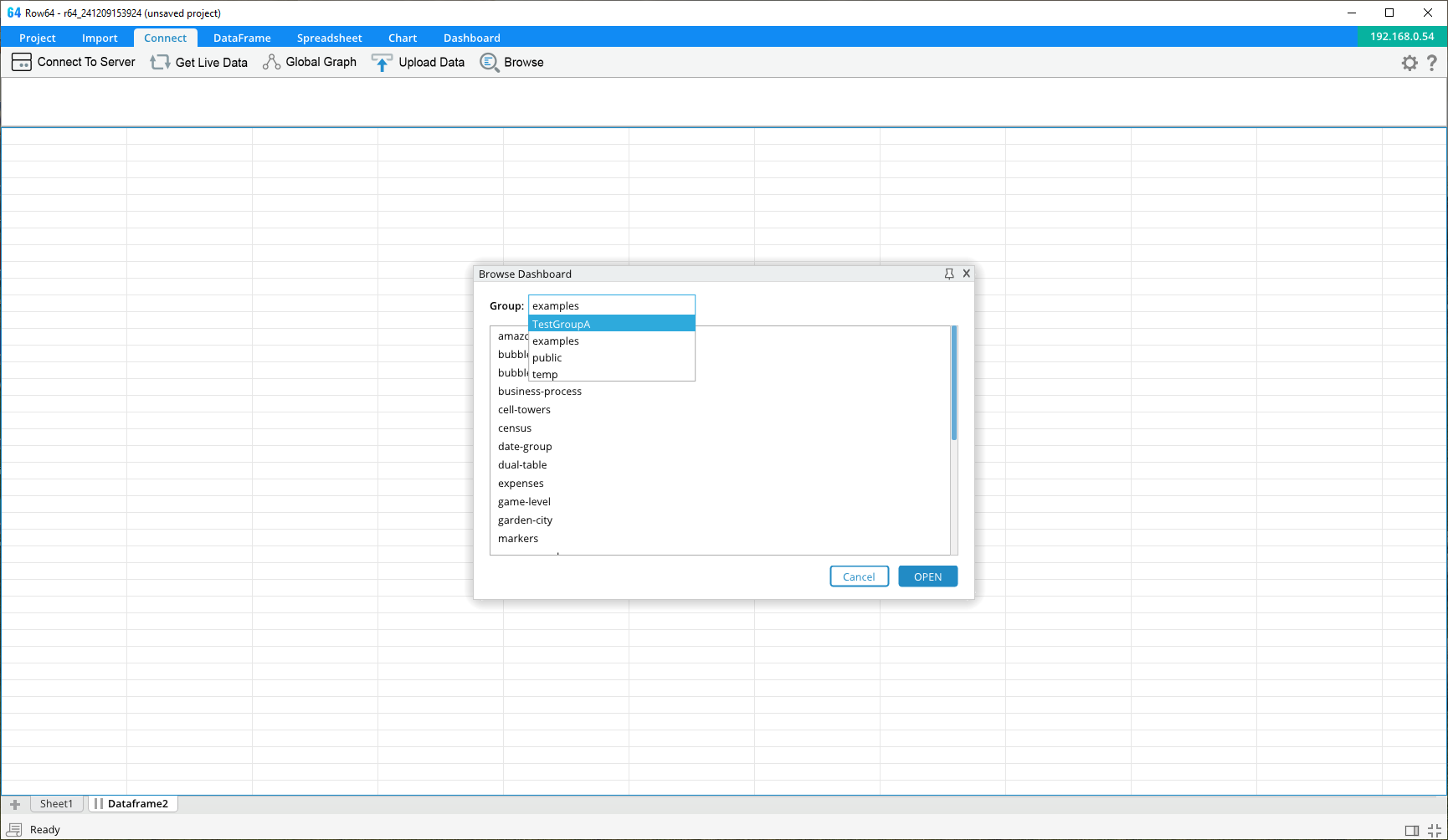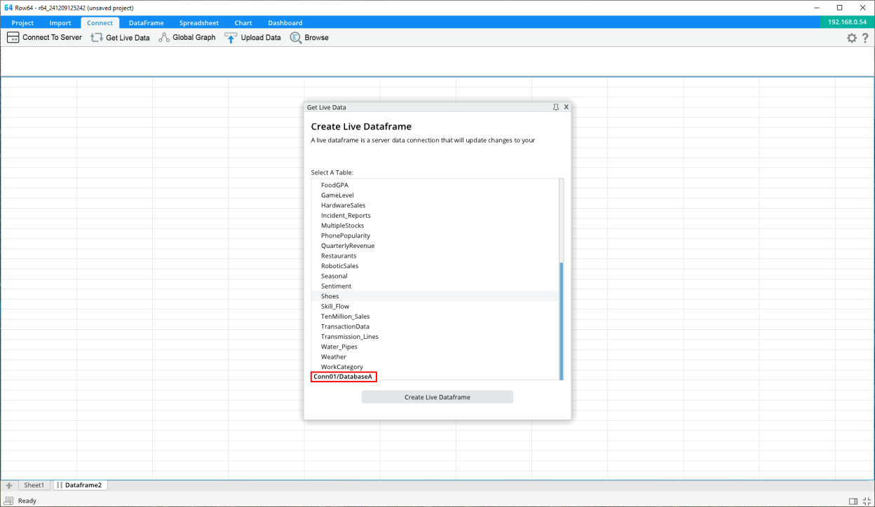 In the Studio app, connect to the server and select the Get Live Dataframe option. In the list of tables, you should see a section for the new connection and database groups in the list.