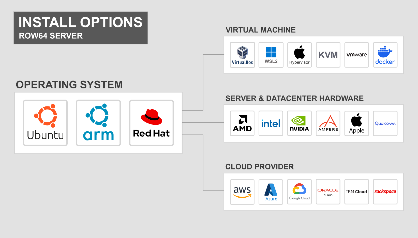 Row64 Server supports several platforms and can be set up on virtual machines, local hardware, or the cloud.