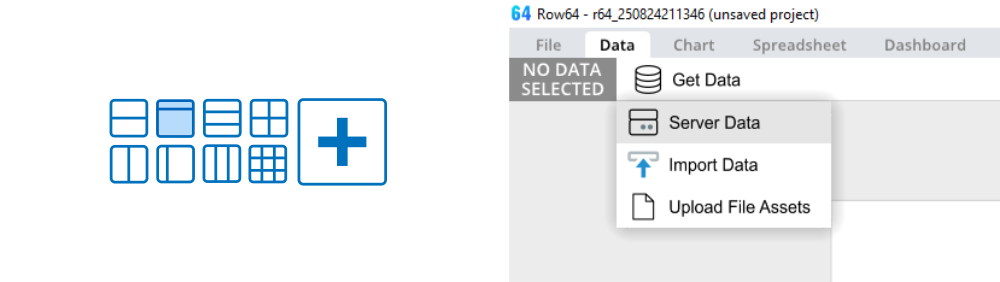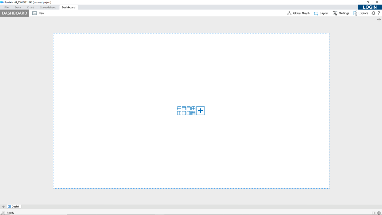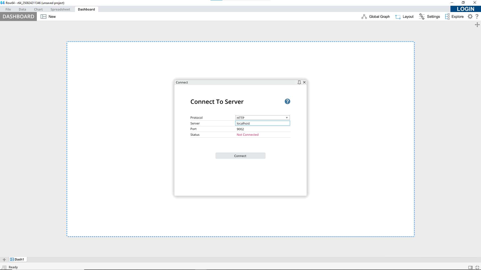 Connect to a Row64 Server by clicking LOGIN on the top right. Enter in the Server field: