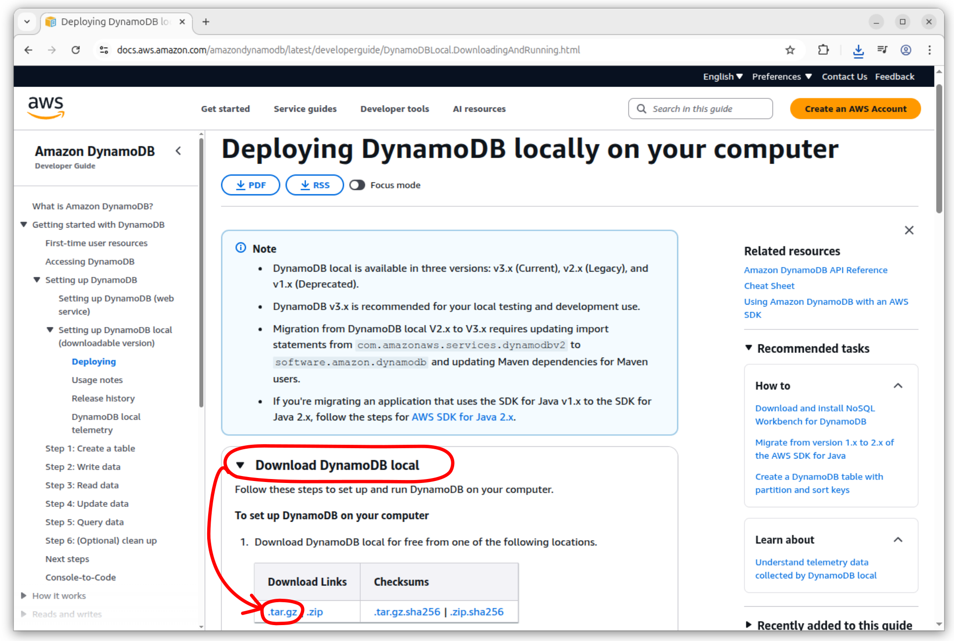 Use the following link to download the latest version of DynamoDB. In the "Download DynamoDB local" category, find the download links and download the .tar.gz.