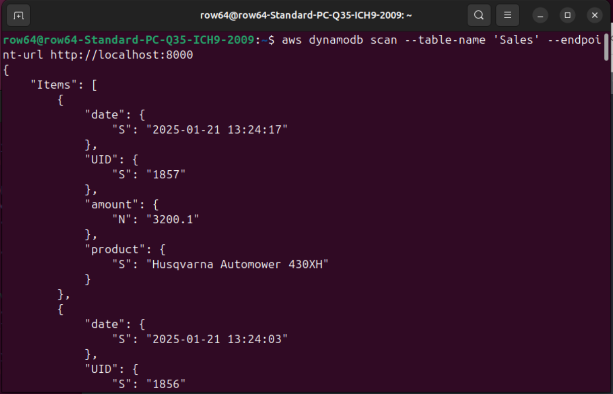 aws dynamodb scan --table-name 'Sales' --endpoint-url http://localhost:8000